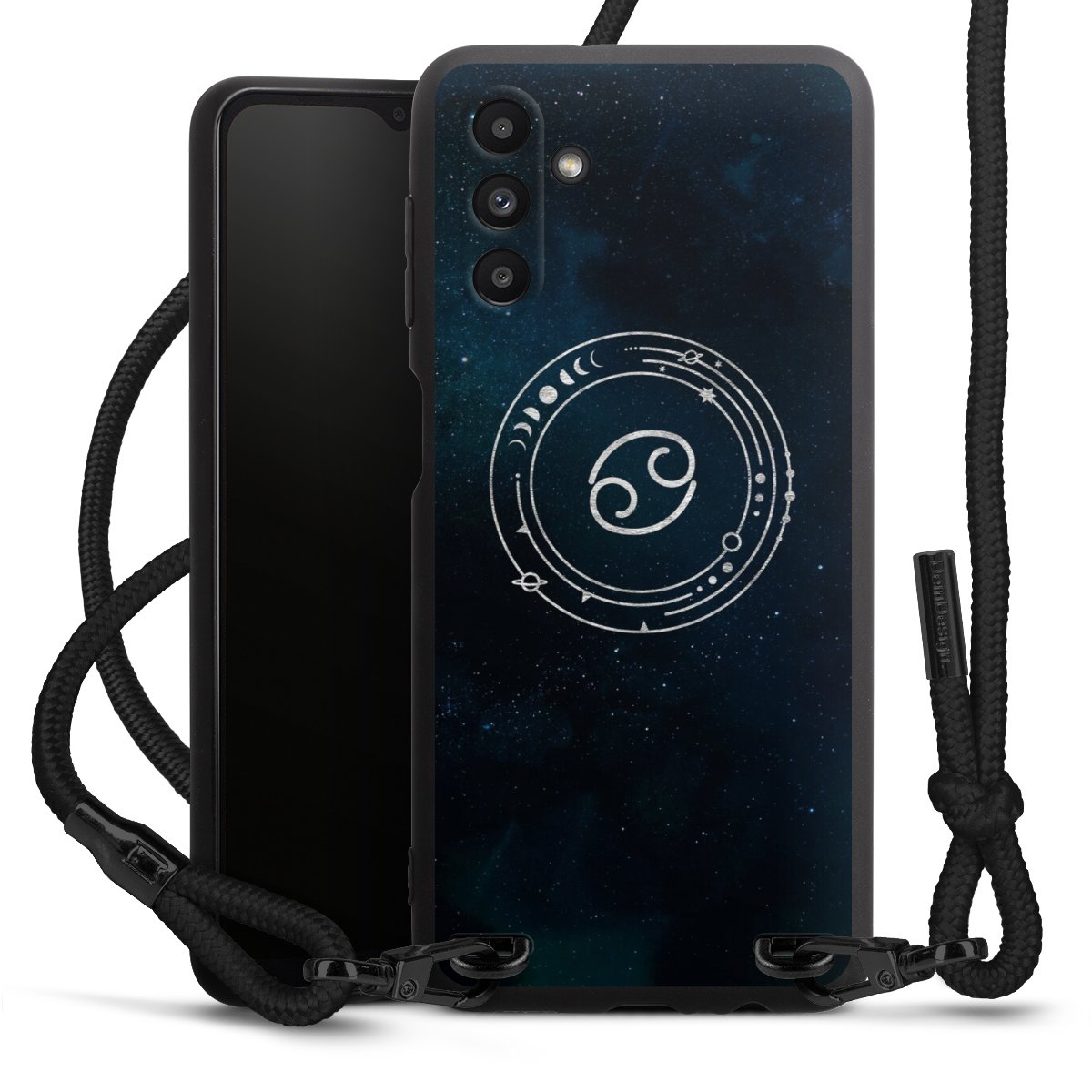 The matt black silicone case is made of flexible TPU (thermoplastic polyurethane) and offers robust protection. The durable, unbreakable material makes the cover flexible and dimensionally stable at the same time. The matte surface makes your design stand out more and is less susceptible to fingerprints and dirt. The stylish trend accessory fits comfortably in the hand and is perfectly complemented by the fabric (polyester) mobile phone strap. The braided fabric strap is approx. 1.70 metres long with a diameter of approx. 0.5 cm. Due to the special knotting technique, the length of the strap can be adjusted by simply pulling it, so that you can adapt it individually to your wishes. The practical case to wear around your neck is available with the fabric strap in black. As a little icing on the cake, we have provided the strap with a chic metal fastener in matt black. The strap is securely fastened to the case with loops made of high-quality genuine leather and press studs. The ends of the fabric strap are covered with metallic end caps and thus protected from fraying.