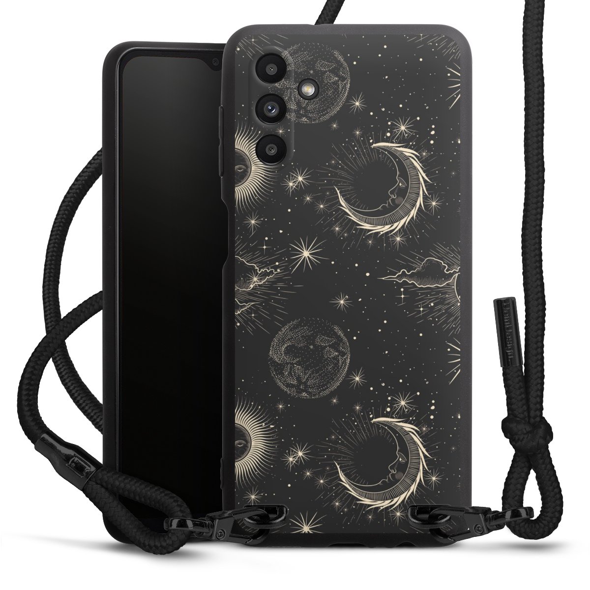 The matt black silicone case is made of flexible TPU (thermoplastic polyurethane) and offers robust protection. The durable, unbreakable material makes the cover flexible and dimensionally stable at the same time. The matte surface makes your design stand out more and is less susceptible to fingerprints and dirt. The stylish trend accessory fits comfortably in the hand and is perfectly complemented by the fabric (polyester) mobile phone strap. The braided fabric strap is approx. 1.70 metres long with a diameter of approx. 0.5 cm. Due to the special knotting technique, the length of the strap can be adjusted by simply pulling it, so that you can adapt it individually to your wishes. The practical case to wear around your neck is available with the fabric strap in black. As a little icing on the cake, we have provided the strap with a chic metal fastener in matt black. The strap is securely fastened to the case with loops made of high-quality genuine leather and press studs. The ends of the fabric strap are covered with metallic end caps and thus protected from fraying.
