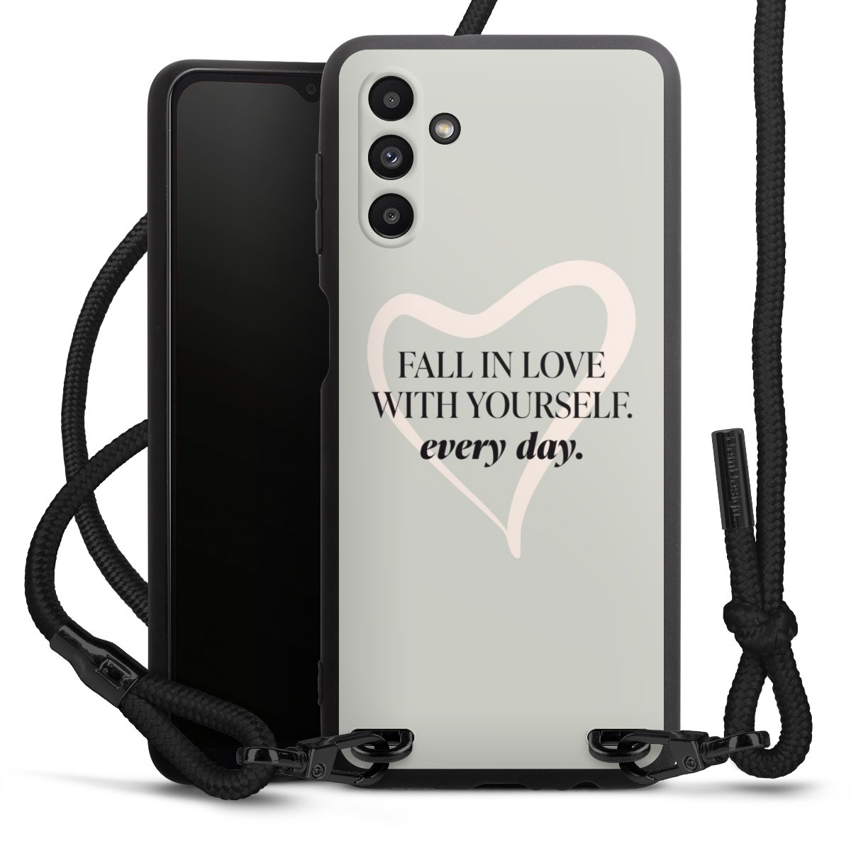 The matt black silicone case is made of flexible TPU (thermoplastic polyurethane) and offers robust protection. The durable, unbreakable material makes the cover flexible and dimensionally stable at the same time. The matte surface makes your design stand out more and is less susceptible to fingerprints and dirt. The stylish trend accessory fits comfortably in the hand and is perfectly complemented by the fabric (polyester) mobile phone strap. The braided fabric strap is approx. 1.70 metres long with a diameter of approx. 0.5 cm. Due to the special knotting technique, the length of the strap can be adjusted by simply pulling it, so that you can adapt it individually to your wishes. The practical case to wear around your neck is available with the fabric strap in black. As a little icing on the cake, we have provided the strap with a chic metal fastener in matt black. The strap is securely fastened to the case with loops made of high-quality genuine leather and press studs. The ends of the fabric strap are covered with metallic end caps and thus protected from fraying.