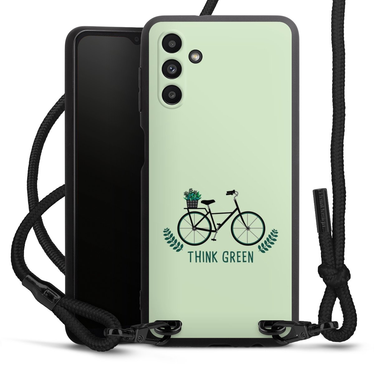 The matt black silicone case is made of flexible TPU (thermoplastic polyurethane) and offers robust protection. The durable, unbreakable material makes the cover flexible and dimensionally stable at the same time. The matte surface makes your design stand out more and is less susceptible to fingerprints and dirt. The stylish trend accessory fits comfortably in the hand and is perfectly complemented by the fabric (polyester) mobile phone strap. The braided fabric strap is approx. 1.70 metres long with a diameter of approx. 0.5 cm. Due to the special knotting technique, the length of the strap can be adjusted by simply pulling it, so that you can adapt it individually to your wishes. The practical case to wear around your neck is available with the fabric strap in black. As a little icing on the cake, we have provided the strap with a chic metal fastener in matt black. The strap is securely fastened to the case with loops made of high-quality genuine leather and press studs. The ends of the fabric strap are covered with metallic end caps and thus protected from fraying.