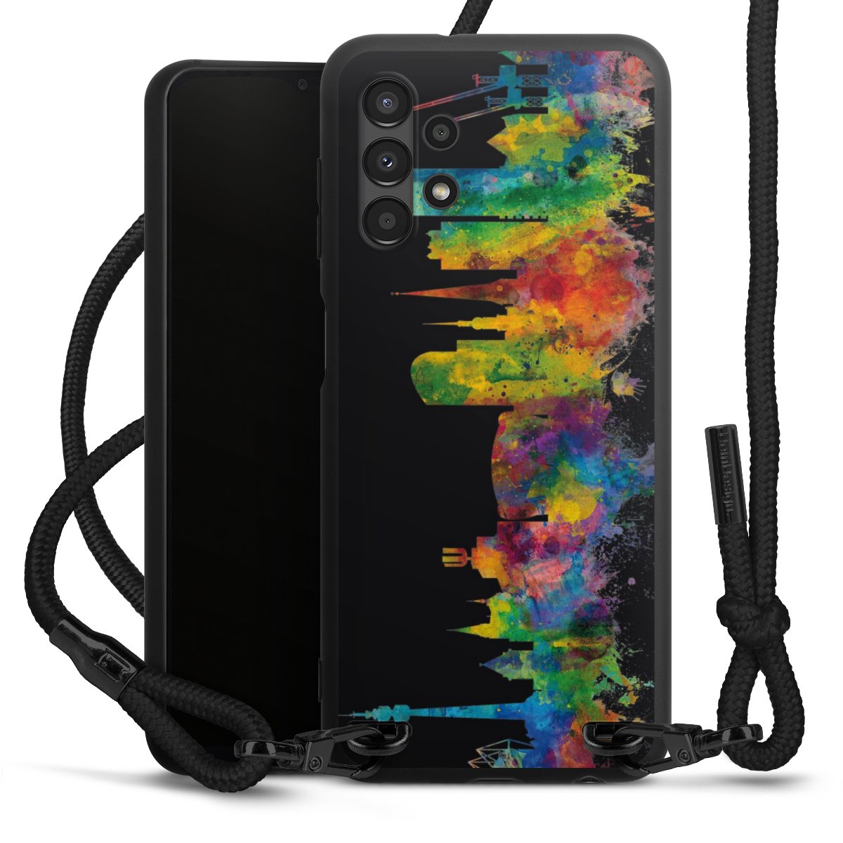 We use the solid direct print process for this phone case, which is why the print area only covers the back and the edge remains unprinted. The case to wear around your neck can be ordered unprinted, fully printed, or partially printed. For your design, either choose one of our exclusive shop motifs or get creative and create your own design, for example with photos and overlays. Design your own personal trend accessory and make an individual statement on the streets!