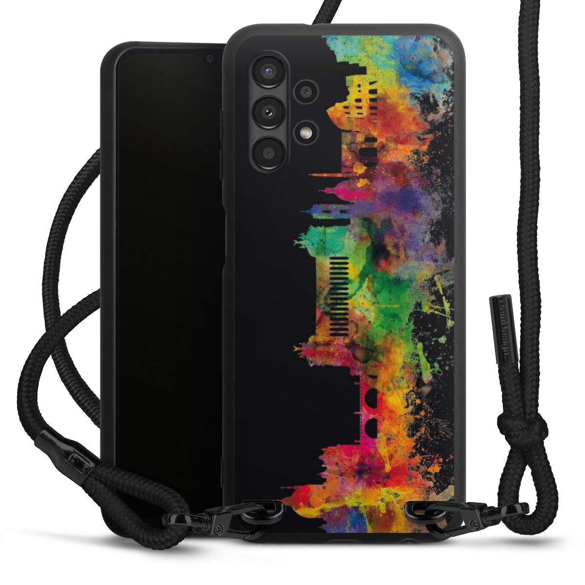 We use the solid direct print process for this phone case, which is why the print area only covers the back and the edge remains unprinted. The case to wear around your neck can be ordered unprinted, fully printed, or partially printed. For your design, either choose one of our exclusive shop motifs or get creative and create your own design, for example with photos and overlays. Design your own personal trend accessory and make an individual statement on the streets!