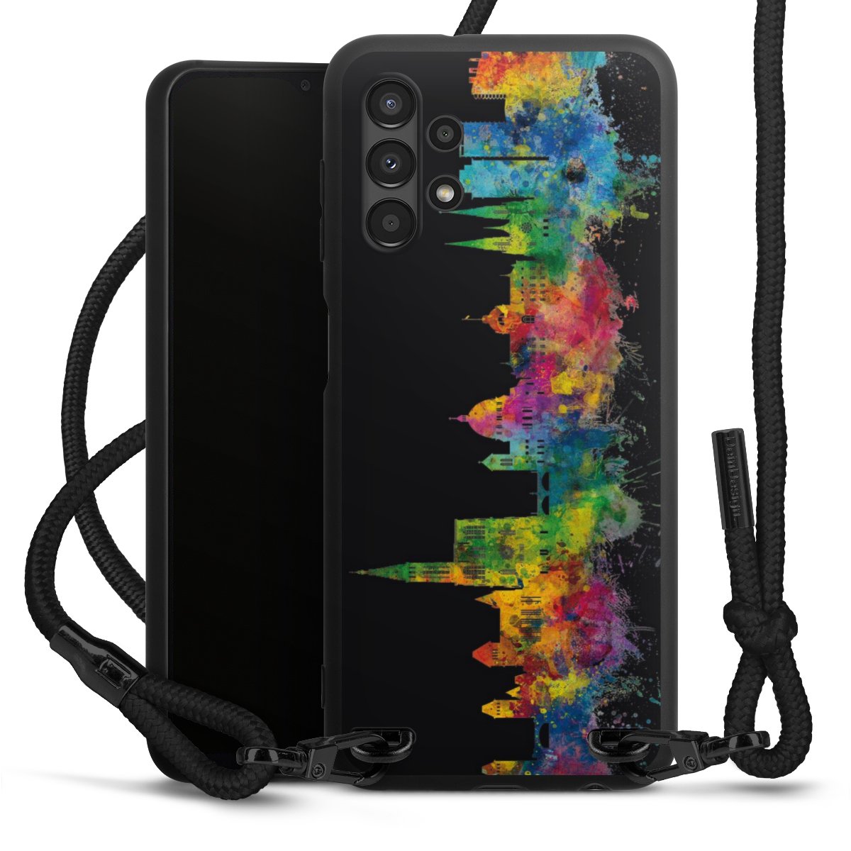 We use the solid direct print process for this phone case, which is why the print area only covers the back and the edge remains unprinted. The case to wear around your neck can be ordered unprinted, fully printed, or partially printed. For your design, either choose one of our exclusive shop motifs or get creative and create your own design, for example with photos and overlays. Design your own personal trend accessory and make an individual statement on the streets!