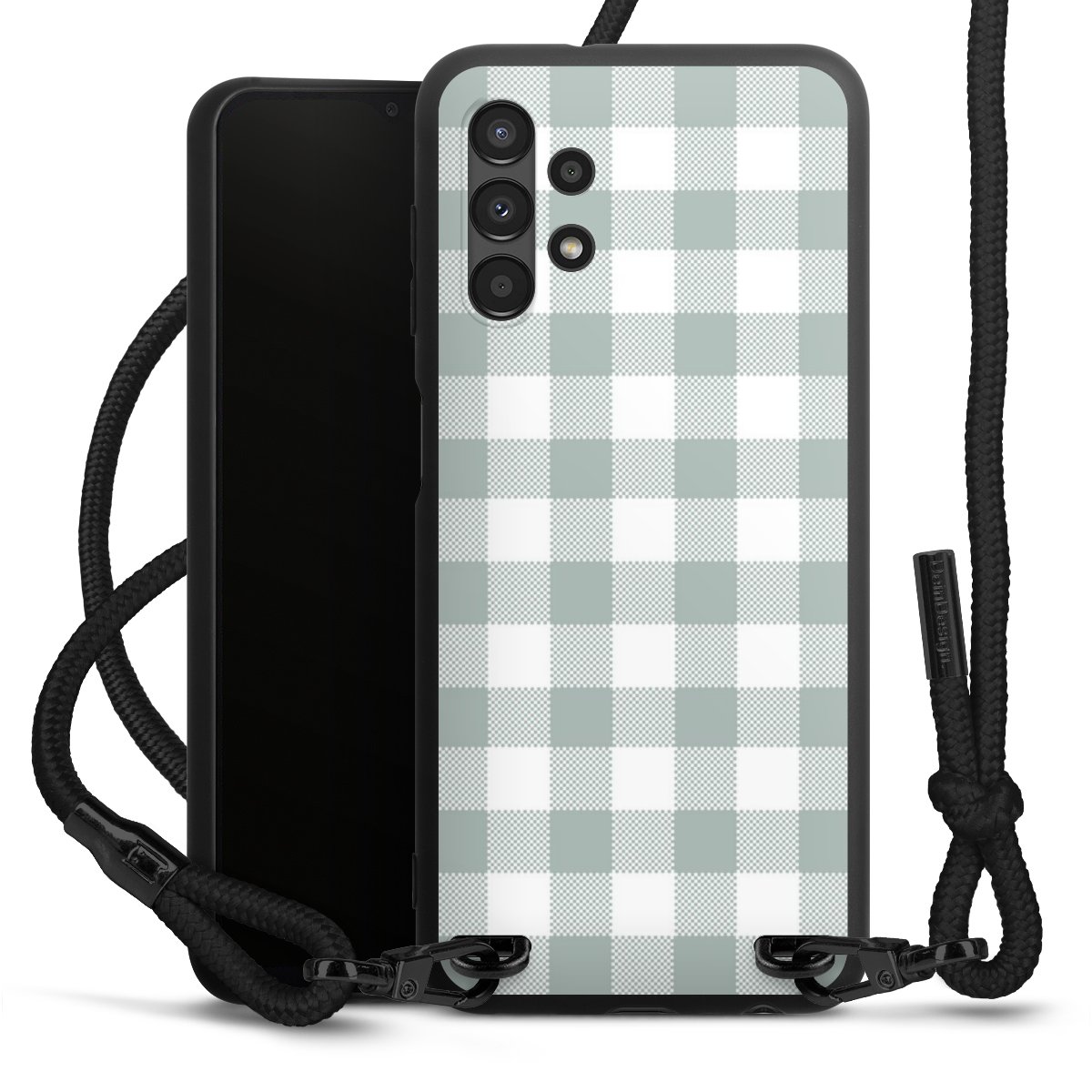 The matt black silicone case is made of flexible TPU (thermoplastic polyurethane) and offers robust protection. The durable, unbreakable material makes the cover flexible and dimensionally stable at the same time. The matte surface makes your design stand out more and is less susceptible to fingerprints and dirt. The stylish trend accessory fits comfortably in the hand and is perfectly complemented by the fabric (polyester) mobile phone strap. The braided fabric strap is approx. 1.70 metres long with a diameter of approx. 0.5 cm. Due to the special knotting technique, the length of the strap can be adjusted by simply pulling it, so that you can adapt it individually to your wishes. The practical case to wear around your neck is available with the fabric strap in black. As a little icing on the cake, we have provided the strap with a chic metal fastener in matt black. The strap is securely fastened to the case with loops made of high-quality genuine leather and press studs. The ends of the fabric strap are covered with metallic end caps and thus protected from fraying.