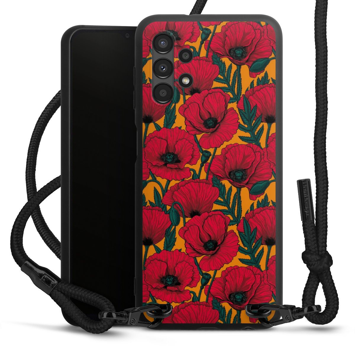 The matt black silicone case is made of flexible TPU (thermoplastic polyurethane) and offers robust protection. The durable, unbreakable material makes the cover flexible and dimensionally stable at the same time. The matte surface makes your design stand out more and is less susceptible to fingerprints and dirt. The stylish trend accessory fits comfortably in the hand and is perfectly complemented by the fabric (polyester) mobile phone strap. The braided fabric strap is approx. 1.70 metres long with a diameter of approx. 0.5 cm. Due to the special knotting technique, the length of the strap can be adjusted by simply pulling it, so that you can adapt it individually to your wishes. The practical case to wear around your neck is available with the fabric strap in black. As a little icing on the cake, we have provided the strap with a chic metal fastener in matt black. The strap is securely fastened to the case with loops made of high-quality genuine leather and press studs. The ends of the fabric strap are covered with metallic end caps and thus protected from fraying.
