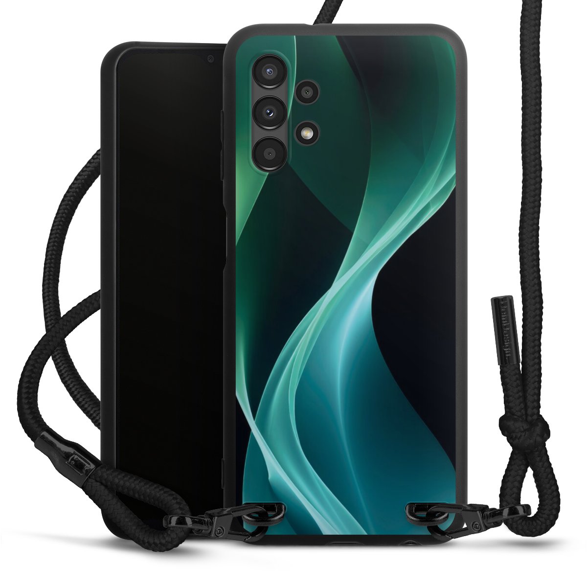 The matt black silicone case is made of flexible TPU (thermoplastic polyurethane) and offers robust protection. The durable, unbreakable material makes the cover flexible and dimensionally stable at the same time. The matte surface makes your design stand out more and is less susceptible to fingerprints and dirt. The stylish trend accessory fits comfortably in the hand and is perfectly complemented by the fabric (polyester) mobile phone strap. The braided fabric strap is approx. 1.70 metres long with a diameter of approx. 0.5 cm. Due to the special knotting technique, the length of the strap can be adjusted by simply pulling it, so that you can adapt it individually to your wishes. The practical case to wear around your neck is available with the fabric strap in black. As a little icing on the cake, we have provided the strap with a chic metal fastener in matt black. The strap is securely fastened to the case with loops made of high-quality genuine leather and press studs. The ends of the fabric strap are covered with metallic end caps and thus protected from fraying.