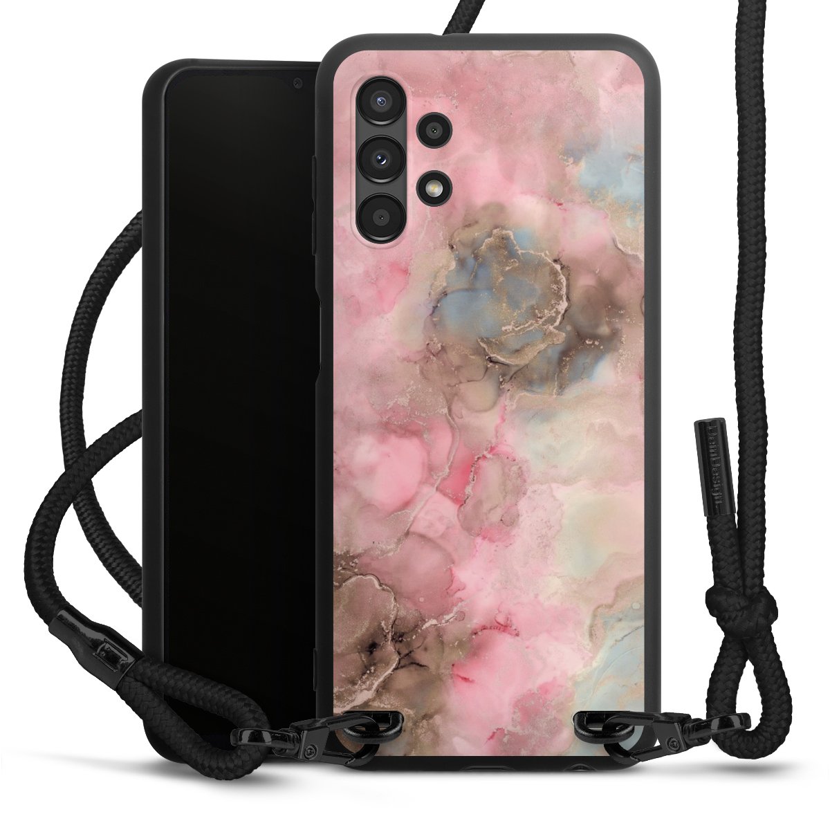 The matt black silicone case is made of flexible TPU (thermoplastic polyurethane) and offers robust protection. The durable, unbreakable material makes the cover flexible and dimensionally stable at the same time. The matte surface makes your design stand out more and is less susceptible to fingerprints and dirt. The stylish trend accessory fits comfortably in the hand and is perfectly complemented by the fabric (polyester) mobile phone strap. The braided fabric strap is approx. 1.70 metres long with a diameter of approx. 0.5 cm. Due to the special knotting technique, the length of the strap can be adjusted by simply pulling it, so that you can adapt it individually to your wishes. The practical case to wear around your neck is available with the fabric strap in black. As a little icing on the cake, we have provided the strap with a chic metal fastener in matt black. The strap is securely fastened to the case with loops made of high-quality genuine leather and press studs. The ends of the fabric strap are covered with metallic end caps and thus protected from fraying.