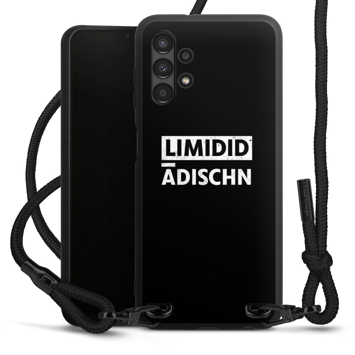 The matt black silicone case is made of flexible TPU (thermoplastic polyurethane) and offers robust protection. The durable, unbreakable material makes the cover flexible and dimensionally stable at the same time. The matte surface makes your design stand out more and is less susceptible to fingerprints and dirt. The stylish trend accessory fits comfortably in the hand and is perfectly complemented by the fabric (polyester) mobile phone strap. The braided fabric strap is approx. 1.70 metres long with a diameter of approx. 0.5 cm. Due to the special knotting technique, the length of the strap can be adjusted by simply pulling it, so that you can adapt it individually to your wishes. The practical case to wear around your neck is available with the fabric strap in black. As a little icing on the cake, we have provided the strap with a chic metal fastener in matt black. The strap is securely fastened to the case with loops made of high-quality genuine leather and press studs. The ends of the fabric strap are covered with metallic end caps and thus protected from fraying.