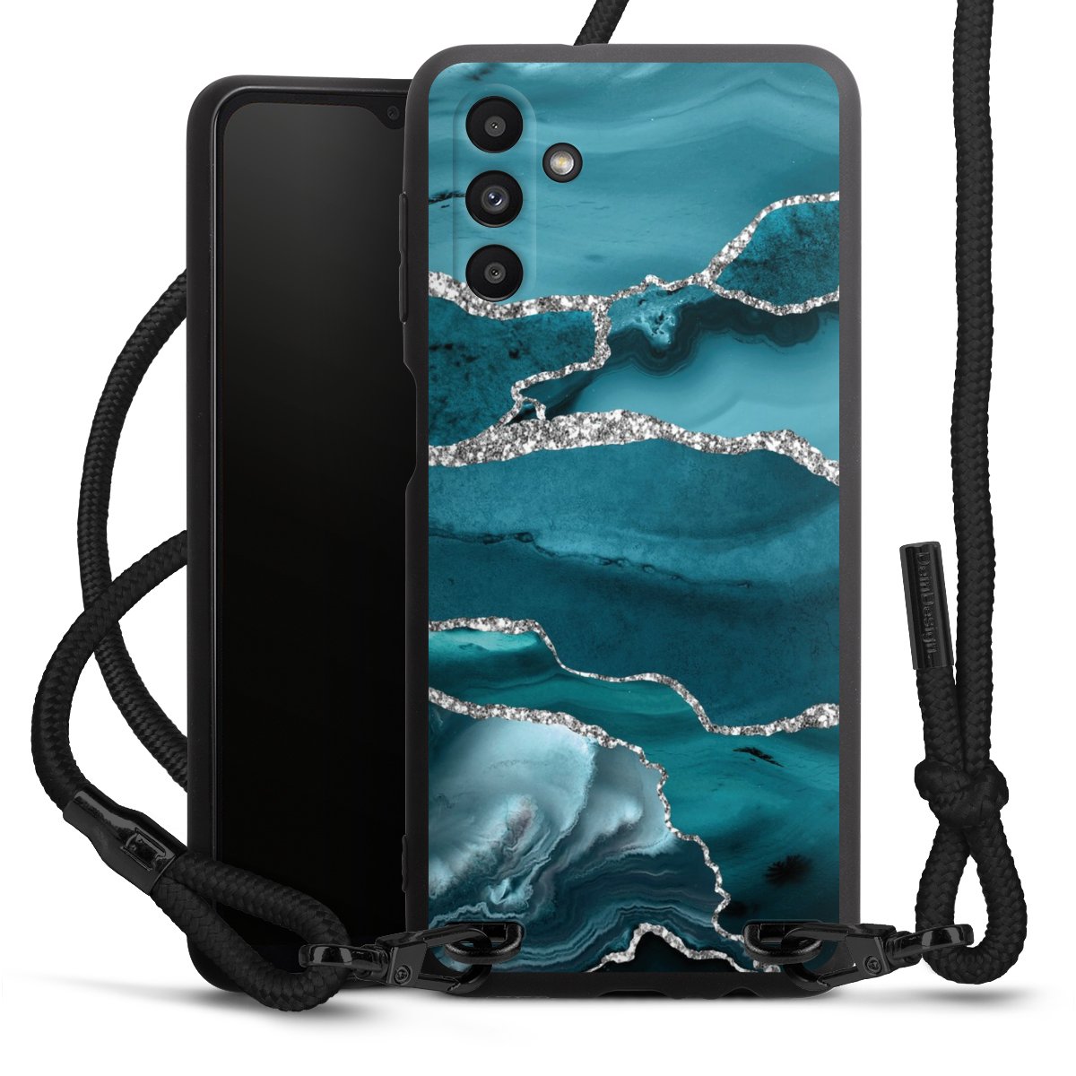 The matt black silicone case is made of flexible TPU (thermoplastic polyurethane) and offers robust protection. The durable, unbreakable material makes the cover flexible and dimensionally stable at the same time. The matte surface makes your design stand out more and is less susceptible to fingerprints and dirt. The stylish trend accessory fits comfortably in the hand and is perfectly complemented by the fabric (polyester) mobile phone strap. The braided fabric strap is approx. 1.70 metres long with a diameter of approx. 0.5 cm. Due to the special knotting technique, the length of the strap can be adjusted by simply pulling it, so that you can adapt it individually to your wishes. The practical case to wear around your neck is available with the fabric strap in black. As a little icing on the cake, we have provided the strap with a chic metal fastener in matt black. The strap is securely fastened to the case with loops made of high-quality genuine leather and press studs. The ends of the fabric strap are covered with metallic end caps and thus protected from fraying.
