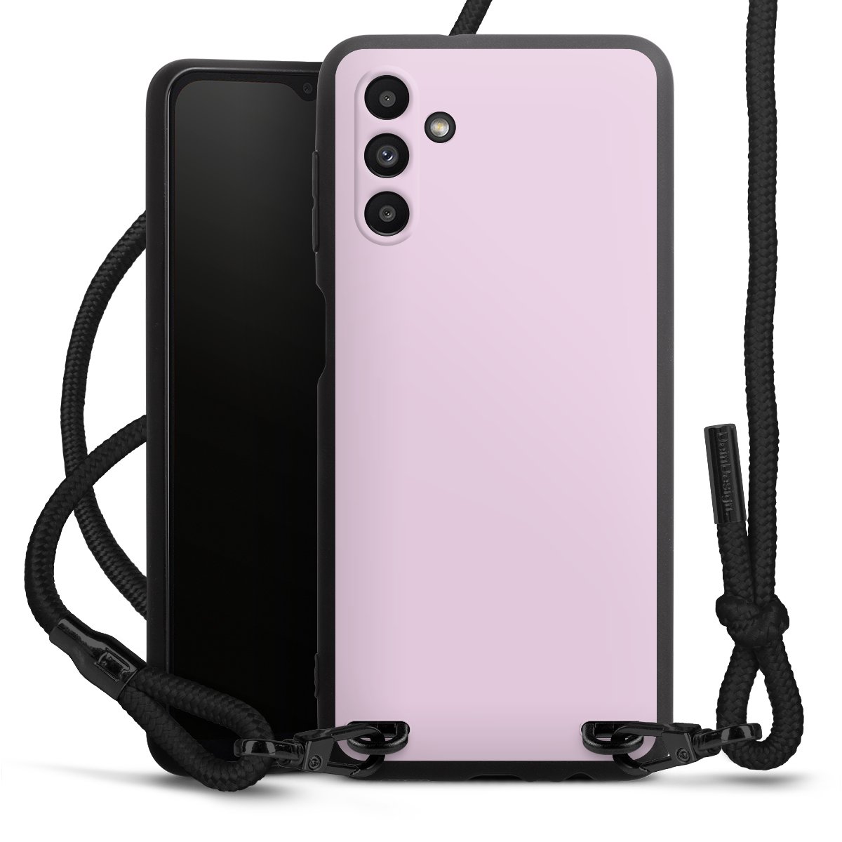 The matt black silicone case is made of flexible TPU (thermoplastic polyurethane) and offers robust protection. The durable, unbreakable material makes the cover flexible and dimensionally stable at the same time. The matte surface makes your design stand out more and is less susceptible to fingerprints and dirt. The stylish trend accessory fits comfortably in the hand and is perfectly complemented by the fabric (polyester) mobile phone strap. The braided fabric strap is approx. 1.70 metres long with a diameter of approx. 0.5 cm. Due to the special knotting technique, the length of the strap can be adjusted by simply pulling it, so that you can adapt it individually to your wishes. The practical case to wear around your neck is available with the fabric strap in black. As a little icing on the cake, we have provided the strap with a chic metal fastener in matt black. The strap is securely fastened to the case with loops made of high-quality genuine leather and press studs. The ends of the fabric strap are covered with metallic end caps and thus protected from fraying.