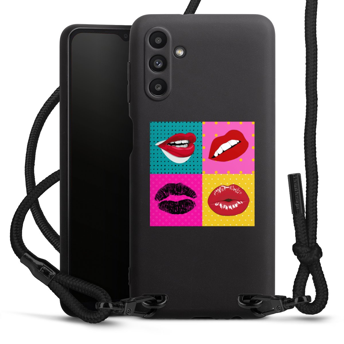 The matt black silicone case is made of flexible TPU (thermoplastic polyurethane) and offers robust protection. The durable, unbreakable material makes the cover flexible and dimensionally stable at the same time. The matte surface makes your design stand out more and is less susceptible to fingerprints and dirt. The stylish trend accessory fits comfortably in the hand and is perfectly complemented by the fabric (polyester) mobile phone strap. The braided fabric strap is approx. 1.70 metres long with a diameter of approx. 0.5 cm. Due to the special knotting technique, the length of the strap can be adjusted by simply pulling it, so that you can adapt it individually to your wishes. The practical case to wear around your neck is available with the fabric strap in black. As a little icing on the cake, we have provided the strap with a chic metal fastener in matt black. The strap is securely fastened to the case with loops made of high-quality genuine leather and press studs. The ends of the fabric strap are covered with metallic end caps and thus protected from fraying.