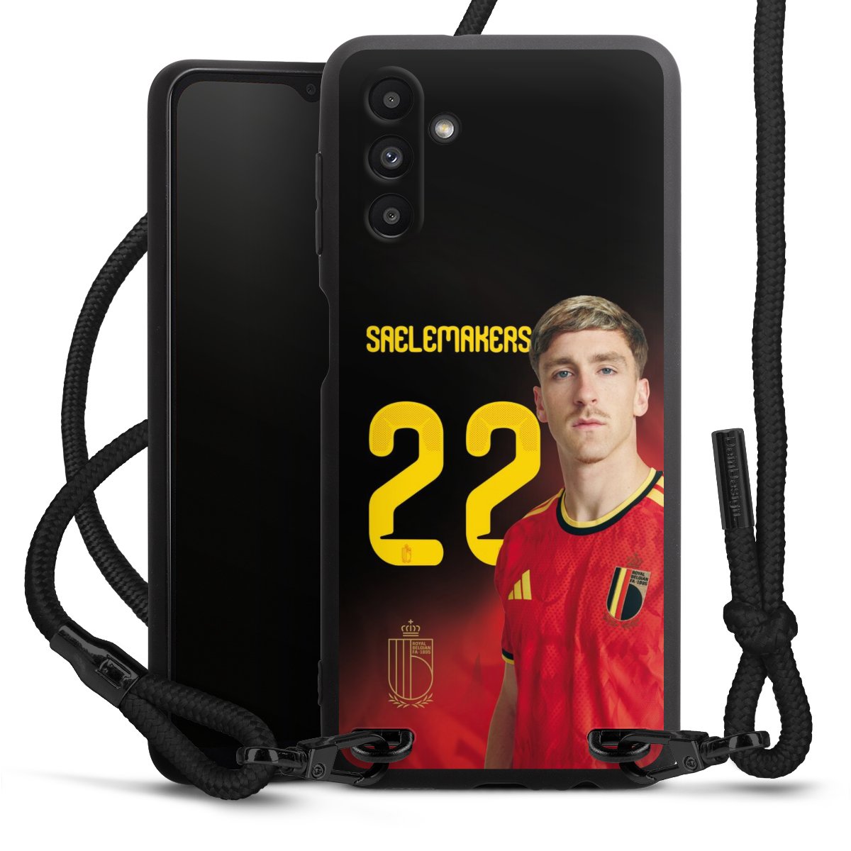 The matt black silicone case is made of flexible TPU (thermoplastic polyurethane) and offers robust protection. The durable, unbreakable material makes the cover flexible and dimensionally stable at the same time. The matte surface makes your design stand out more and is less susceptible to fingerprints and dirt. The stylish trend accessory fits comfortably in the hand and is perfectly complemented by the fabric (polyester) mobile phone strap. The braided fabric strap is approx. 1.70 metres long with a diameter of approx. 0.5 cm. Due to the special knotting technique, the length of the strap can be adjusted by simply pulling it, so that you can adapt it individually to your wishes. The practical case to wear around your neck is available with the fabric strap in black. As a little icing on the cake, we have provided the strap with a chic metal fastener in matt black. The strap is securely fastened to the case with loops made of high-quality genuine leather and press studs. The ends of the fabric strap are covered with metallic end caps and thus protected from fraying.