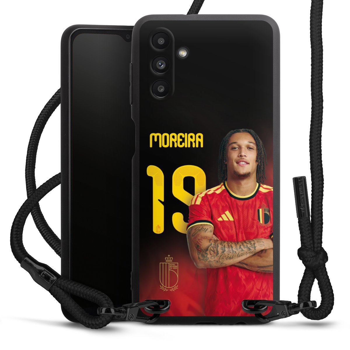 The matt black silicone case is made of flexible TPU (thermoplastic polyurethane) and offers robust protection. The durable, unbreakable material makes the cover flexible and dimensionally stable at the same time. The matte surface makes your design stand out more and is less susceptible to fingerprints and dirt. The stylish trend accessory fits comfortably in the hand and is perfectly complemented by the fabric (polyester) mobile phone strap. The braided fabric strap is approx. 1.70 metres long with a diameter of approx. 0.5 cm. Due to the special knotting technique, the length of the strap can be adjusted by simply pulling it, so that you can adapt it individually to your wishes. The practical case to wear around your neck is available with the fabric strap in black. As a little icing on the cake, we have provided the strap with a chic metal fastener in matt black. The strap is securely fastened to the case with loops made of high-quality genuine leather and press studs. The ends of the fabric strap are covered with metallic end caps and thus protected from fraying.