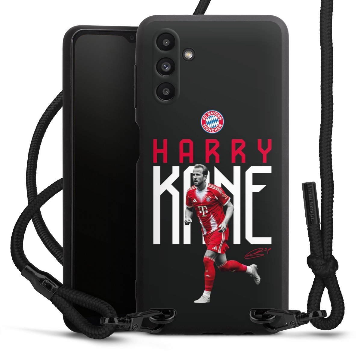 The matt black silicone case is made of flexible TPU (thermoplastic polyurethane) and offers robust protection. The durable, unbreakable material makes the cover flexible and dimensionally stable at the same time. The matte surface makes your design stand out more and is less susceptible to fingerprints and dirt. The stylish trend accessory fits comfortably in the hand and is perfectly complemented by the fabric (polyester) mobile phone strap. The braided fabric strap is approx. 1.70 metres long with a diameter of approx. 0.5 cm. Due to the special knotting technique, the length of the strap can be adjusted by simply pulling it, so that you can adapt it individually to your wishes. The practical case to wear around your neck is available with the fabric strap in black. As a little icing on the cake, we have provided the strap with a chic metal fastener in matt black. The strap is securely fastened to the case with loops made of high-quality genuine leather and press studs. The ends of the fabric strap are covered with metallic end caps and thus protected from fraying.