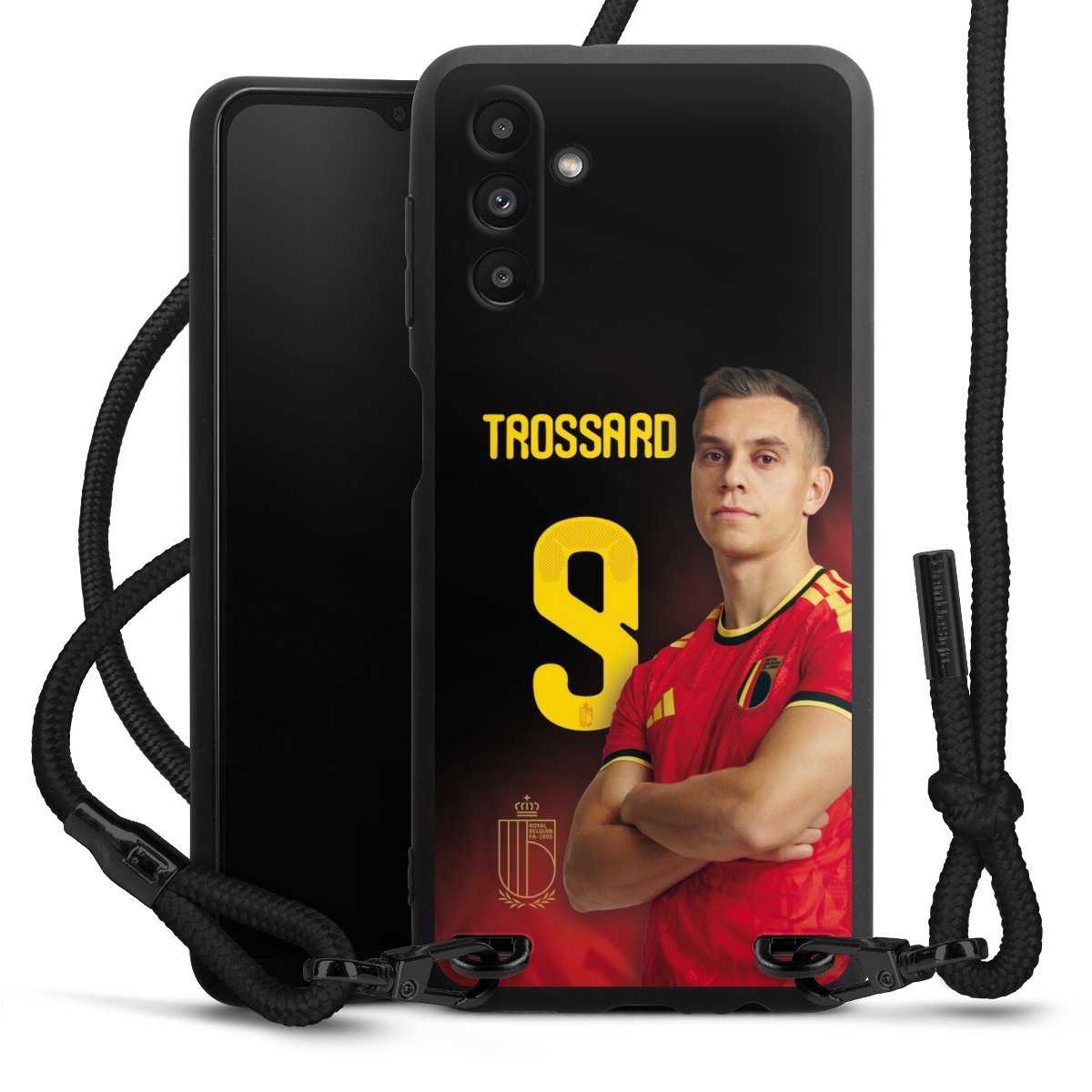 The matt black silicone case is made of flexible TPU (thermoplastic polyurethane) and offers robust protection. The durable, unbreakable material makes the cover flexible and dimensionally stable at the same time. The matte surface makes your design stand out more and is less susceptible to fingerprints and dirt. The stylish trend accessory fits comfortably in the hand and is perfectly complemented by the fabric (polyester) mobile phone strap. The braided fabric strap is approx. 1.70 metres long with a diameter of approx. 0.5 cm. Due to the special knotting technique, the length of the strap can be adjusted by simply pulling it, so that you can adapt it individually to your wishes. The practical case to wear around your neck is available with the fabric strap in black. As a little icing on the cake, we have provided the strap with a chic metal fastener in matt black. The strap is securely fastened to the case with loops made of high-quality genuine leather and press studs. The ends of the fabric strap are covered with metallic end caps and thus protected from fraying.