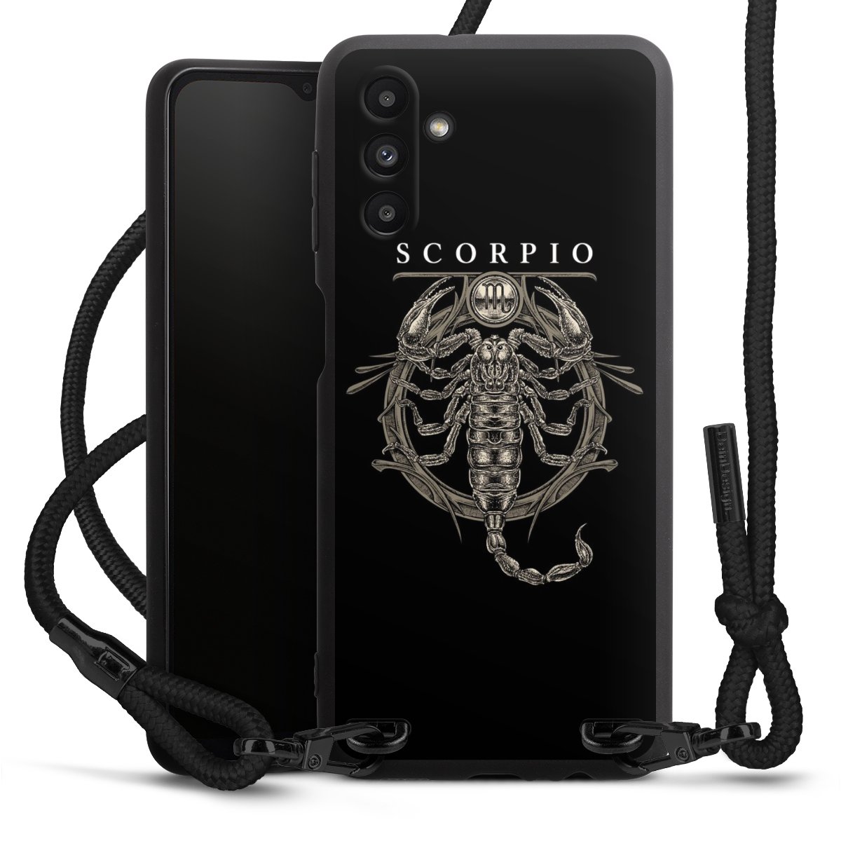 The matt black silicone case is made of flexible TPU (thermoplastic polyurethane) and offers robust protection. The durable, unbreakable material makes the cover flexible and dimensionally stable at the same time. The matte surface makes your design stand out more and is less susceptible to fingerprints and dirt. The stylish trend accessory fits comfortably in the hand and is perfectly complemented by the fabric (polyester) mobile phone strap. The braided fabric strap is approx. 1.70 metres long with a diameter of approx. 0.5 cm. Due to the special knotting technique, the length of the strap can be adjusted by simply pulling it, so that you can adapt it individually to your wishes. The practical case to wear around your neck is available with the fabric strap in black. As a little icing on the cake, we have provided the strap with a chic metal fastener in matt black. The strap is securely fastened to the case with loops made of high-quality genuine leather and press studs. The ends of the fabric strap are covered with metallic end caps and thus protected from fraying.