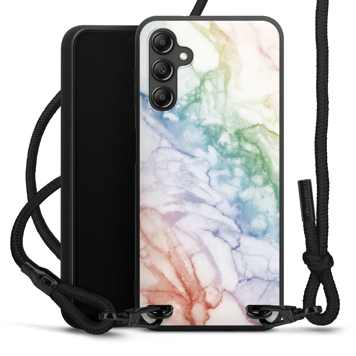 The matt black silicone case is made of flexible TPU (thermoplastic polyurethane) and offers robust protection. The durable, unbreakable material makes the cover flexible and dimensionally stable at the same time. The matte surface makes your design stand out more and is less susceptible to fingerprints and dirt. The stylish trend accessory fits comfortably in the hand and is perfectly complemented by the fabric (polyester) mobile phone strap. The braided fabric strap is approx. 1.70 metres long with a diameter of approx. 0.5 cm. Due to the special knotting technique, the length of the strap can be adjusted by simply pulling it, so that you can adapt it individually to your wishes. The practical case to wear around your neck is available with the fabric strap in black. As a little icing on the cake, we have provided the strap with a chic metal fastener in matt black. The strap is securely fastened to the case with loops made of high-quality genuine leather and press studs. The ends of the fabric strap are covered with metallic end caps and thus protected from fraying.