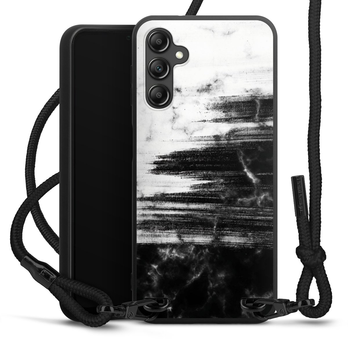 The matt black silicone case is made of flexible TPU (thermoplastic polyurethane) and offers robust protection. The durable, unbreakable material makes the cover flexible and dimensionally stable at the same time. The matte surface makes your design stand out more and is less susceptible to fingerprints and dirt. The stylish trend accessory fits comfortably in the hand and is perfectly complemented by the fabric (polyester) mobile phone strap. The braided fabric strap is approx. 1.70 metres long with a diameter of approx. 0.5 cm. Due to the special knotting technique, the length of the strap can be adjusted by simply pulling it, so that you can adapt it individually to your wishes. The practical case to wear around your neck is available with the fabric strap in black. As a little icing on the cake, we have provided the strap with a chic metal fastener in matt black. The strap is securely fastened to the case with loops made of high-quality genuine leather and press studs. The ends of the fabric strap are covered with metallic end caps and thus protected from fraying.
