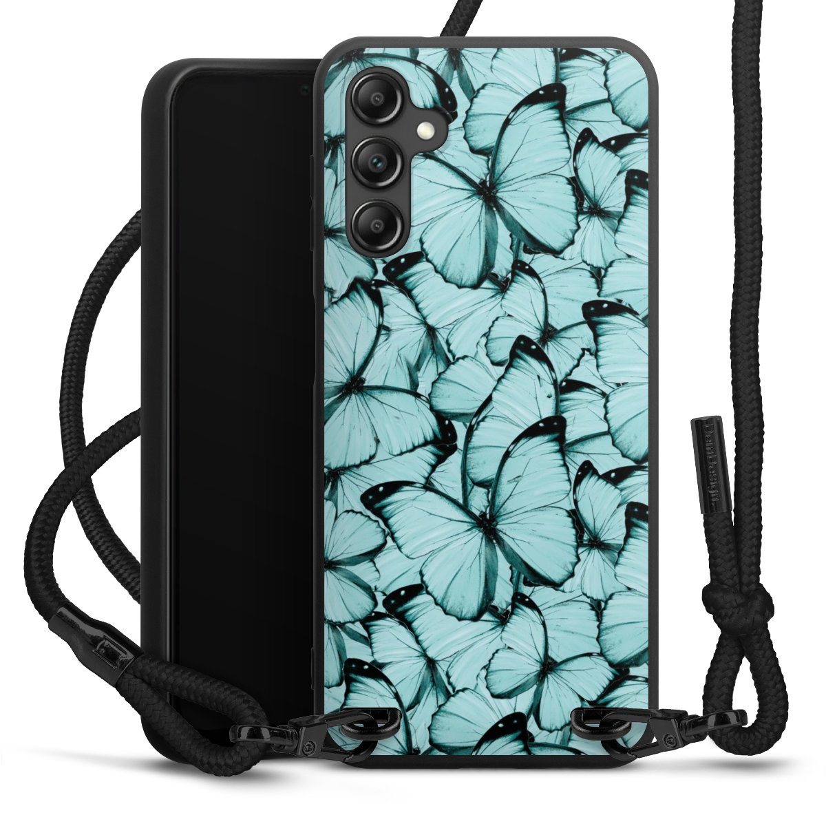 The matt black silicone case is made of flexible TPU (thermoplastic polyurethane) and offers robust protection. The durable, unbreakable material makes the cover flexible and dimensionally stable at the same time. The matte surface makes your design stand out more and is less susceptible to fingerprints and dirt. The stylish trend accessory fits comfortably in the hand and is perfectly complemented by the fabric (polyester) mobile phone strap. The braided fabric strap is approx. 1.70 metres long with a diameter of approx. 0.5 cm. Due to the special knotting technique, the length of the strap can be adjusted by simply pulling it, so that you can adapt it individually to your wishes. The practical case to wear around your neck is available with the fabric strap in black. As a little icing on the cake, we have provided the strap with a chic metal fastener in matt black. The strap is securely fastened to the case with loops made of high-quality genuine leather and press studs. The ends of the fabric strap are covered with metallic end caps and thus protected from fraying.