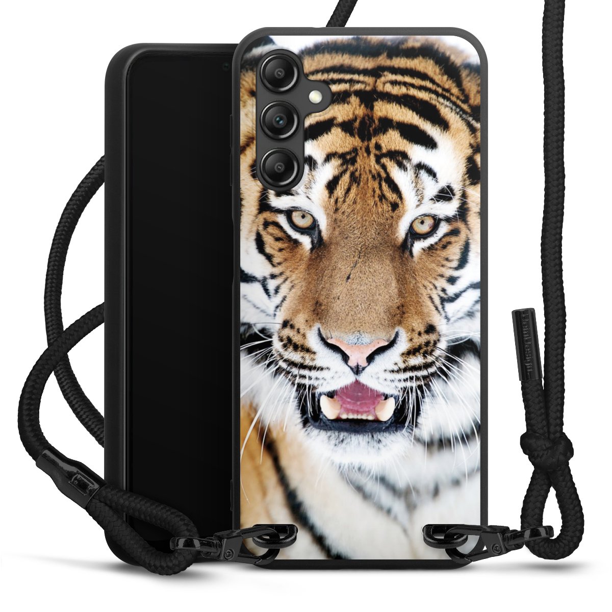 The matt black silicone case is made of flexible TPU (thermoplastic polyurethane) and offers robust protection. The durable, unbreakable material makes the cover flexible and dimensionally stable at the same time. The matte surface makes your design stand out more and is less susceptible to fingerprints and dirt. The stylish trend accessory fits comfortably in the hand and is perfectly complemented by the fabric (polyester) mobile phone strap. The braided fabric strap is approx. 1.70 metres long with a diameter of approx. 0.5 cm. Due to the special knotting technique, the length of the strap can be adjusted by simply pulling it, so that you can adapt it individually to your wishes. The practical case to wear around your neck is available with the fabric strap in black. As a little icing on the cake, we have provided the strap with a chic metal fastener in matt black. The strap is securely fastened to the case with loops made of high-quality genuine leather and press studs. The ends of the fabric strap are covered with metallic end caps and thus protected from fraying.