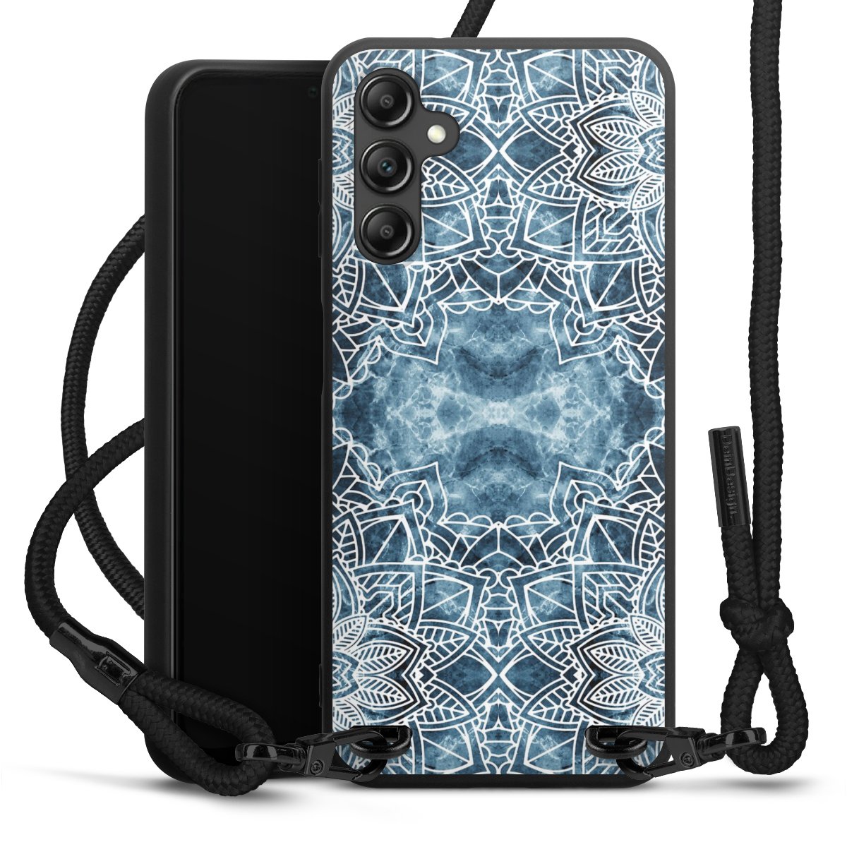The matt black silicone case is made of flexible TPU (thermoplastic polyurethane) and offers robust protection. The durable, unbreakable material makes the cover flexible and dimensionally stable at the same time. The matte surface makes your design stand out more and is less susceptible to fingerprints and dirt. The stylish trend accessory fits comfortably in the hand and is perfectly complemented by the fabric (polyester) mobile phone strap. The braided fabric strap is approx. 1.70 metres long with a diameter of approx. 0.5 cm. Due to the special knotting technique, the length of the strap can be adjusted by simply pulling it, so that you can adapt it individually to your wishes. The practical case to wear around your neck is available with the fabric strap in black. As a little icing on the cake, we have provided the strap with a chic metal fastener in matt black. The strap is securely fastened to the case with loops made of high-quality genuine leather and press studs. The ends of the fabric strap are covered with metallic end caps and thus protected from fraying.
