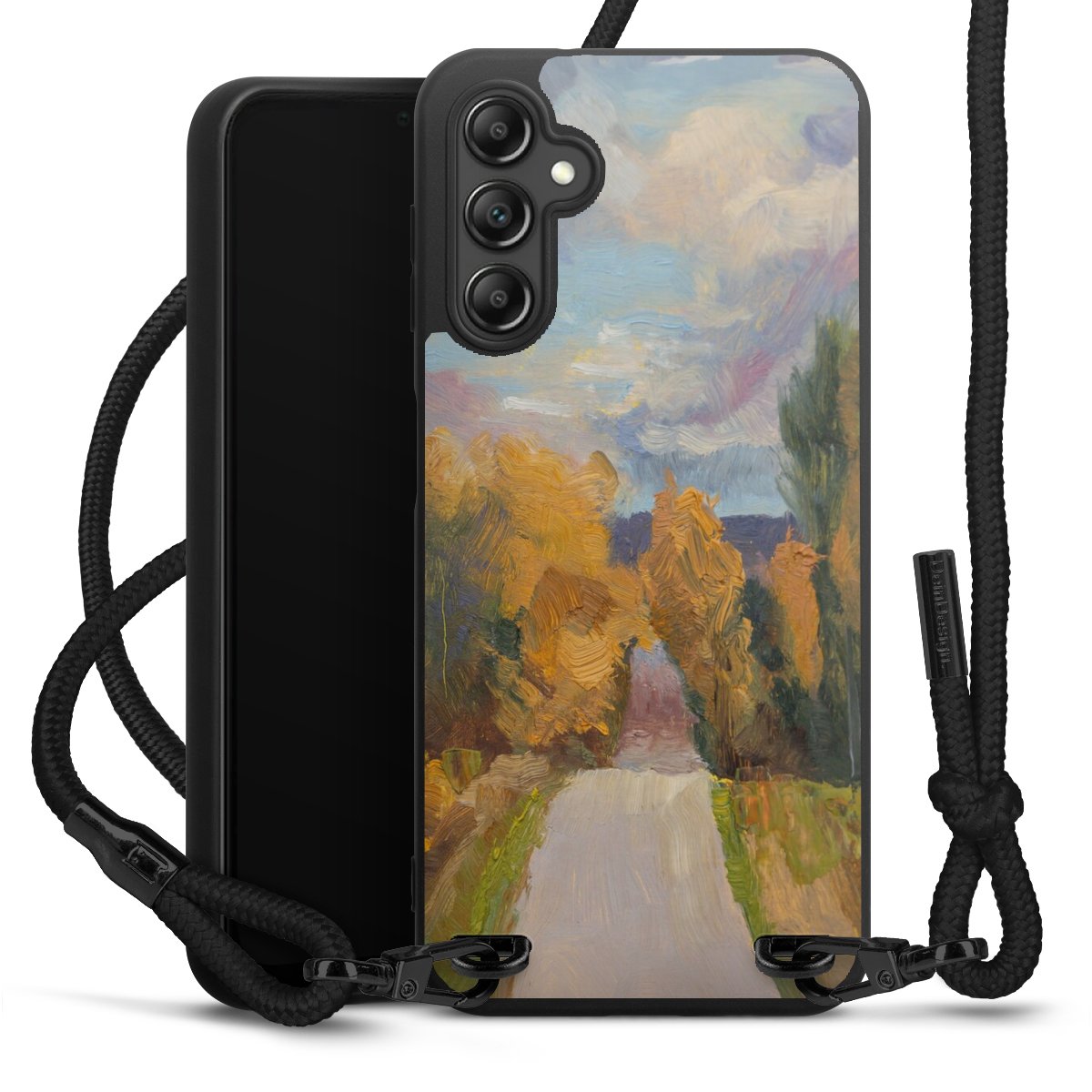 The matt black silicone case is made of flexible TPU (thermoplastic polyurethane) and offers robust protection. The durable, unbreakable material makes the cover flexible and dimensionally stable at the same time. The matte surface makes your design stand out more and is less susceptible to fingerprints and dirt. The stylish trend accessory fits comfortably in the hand and is perfectly complemented by the fabric (polyester) mobile phone strap. The braided fabric strap is approx. 1.70 metres long with a diameter of approx. 0.5 cm. Due to the special knotting technique, the length of the strap can be adjusted by simply pulling it, so that you can adapt it individually to your wishes. The practical case to wear around your neck is available with the fabric strap in black. As a little icing on the cake, we have provided the strap with a chic metal fastener in matt black. The strap is securely fastened to the case with loops made of high-quality genuine leather and press studs. The ends of the fabric strap are covered with metallic end caps and thus protected from fraying.