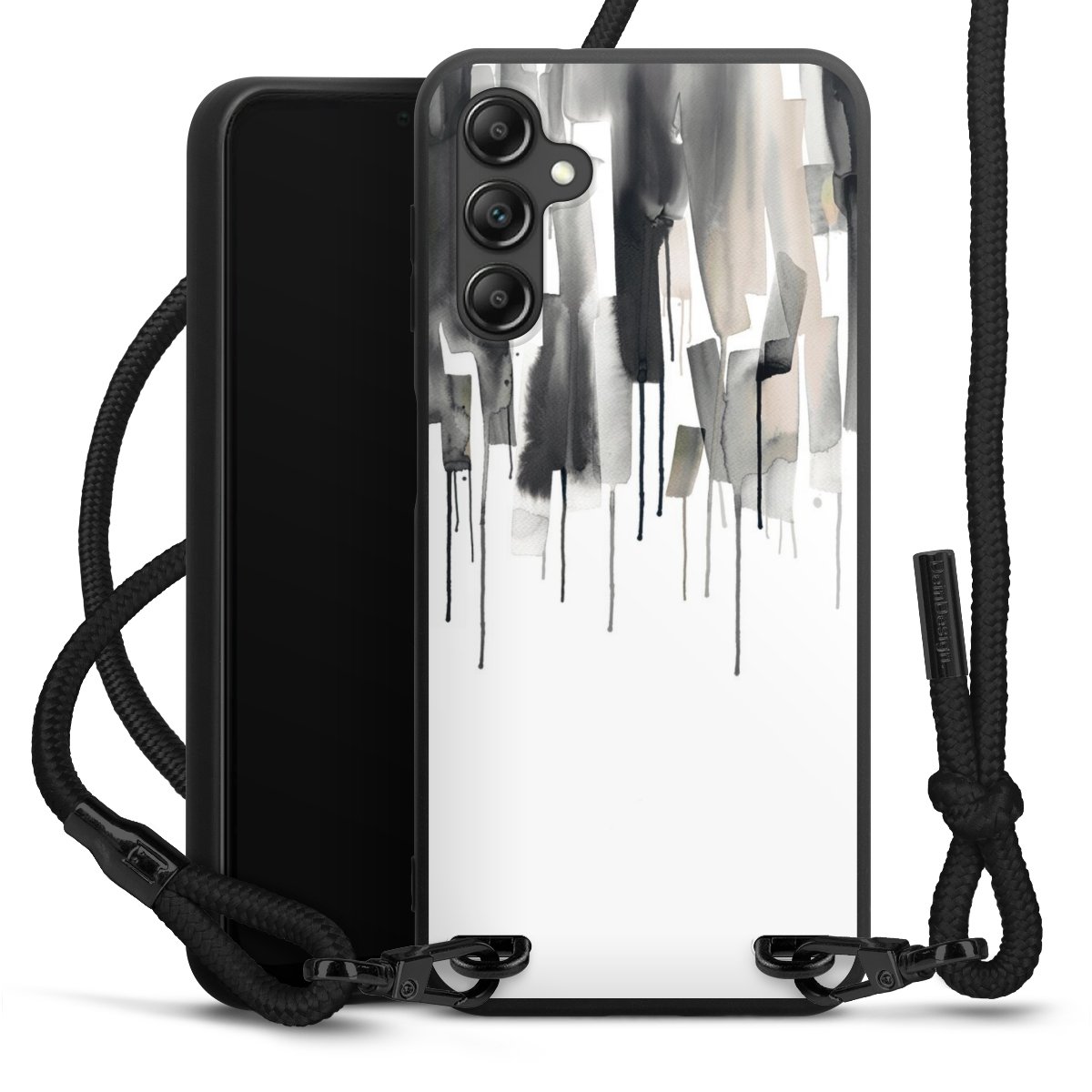 The matt black silicone case is made of flexible TPU (thermoplastic polyurethane) and offers robust protection. The durable, unbreakable material makes the cover flexible and dimensionally stable at the same time. The matte surface makes your design stand out more and is less susceptible to fingerprints and dirt. The stylish trend accessory fits comfortably in the hand and is perfectly complemented by the fabric (polyester) mobile phone strap. The braided fabric strap is approx. 1.70 metres long with a diameter of approx. 0.5 cm. Due to the special knotting technique, the length of the strap can be adjusted by simply pulling it, so that you can adapt it individually to your wishes. The practical case to wear around your neck is available with the fabric strap in black. As a little icing on the cake, we have provided the strap with a chic metal fastener in matt black. The strap is securely fastened to the case with loops made of high-quality genuine leather and press studs. The ends of the fabric strap are covered with metallic end caps and thus protected from fraying.