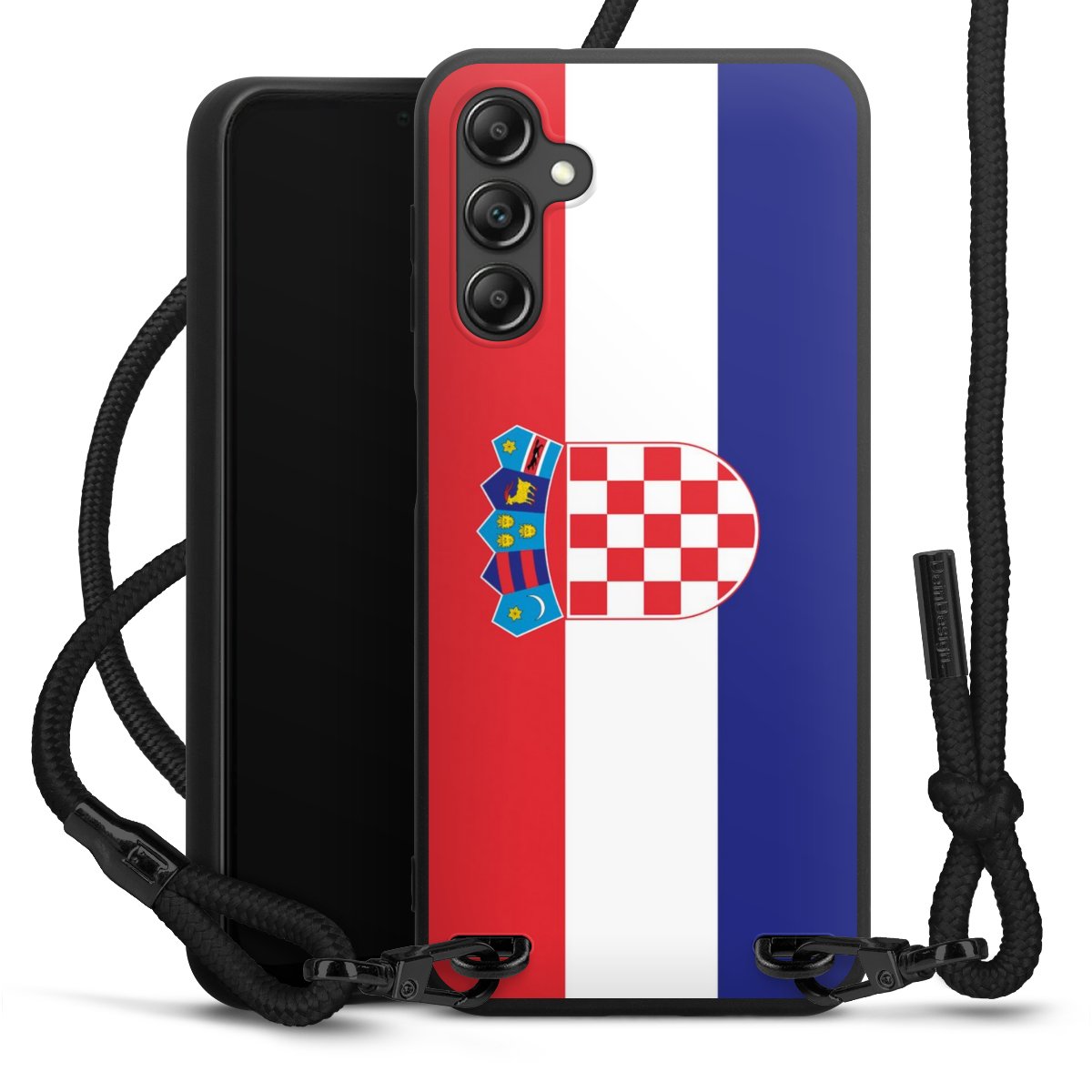 The matt black silicone case is made of flexible TPU (thermoplastic polyurethane) and offers robust protection. The durable, unbreakable material makes the cover flexible and dimensionally stable at the same time. The matte surface makes your design stand out more and is less susceptible to fingerprints and dirt. The stylish trend accessory fits comfortably in the hand and is perfectly complemented by the fabric (polyester) mobile phone strap. The braided fabric strap is approx. 1.70 metres long with a diameter of approx. 0.5 cm. Due to the special knotting technique, the length of the strap can be adjusted by simply pulling it, so that you can adapt it individually to your wishes. The practical case to wear around your neck is available with the fabric strap in black. As a little icing on the cake, we have provided the strap with a chic metal fastener in matt black. The strap is securely fastened to the case with loops made of high-quality genuine leather and press studs. The ends of the fabric strap are covered with metallic end caps and thus protected from fraying.