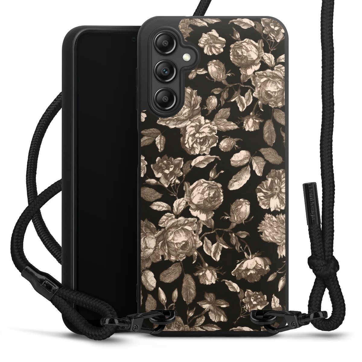 The matt black silicone case is made of flexible TPU (thermoplastic polyurethane) and offers robust protection. The durable, unbreakable material makes the cover flexible and dimensionally stable at the same time. The matte surface makes your design stand out more and is less susceptible to fingerprints and dirt. The stylish trend accessory fits comfortably in the hand and is perfectly complemented by the fabric (polyester) mobile phone strap. The braided fabric strap is approx. 1.70 metres long with a diameter of approx. 0.5 cm. Due to the special knotting technique, the length of the strap can be adjusted by simply pulling it, so that you can adapt it individually to your wishes. The practical case to wear around your neck is available with the fabric strap in black. As a little icing on the cake, we have provided the strap with a chic metal fastener in matt black. The strap is securely fastened to the case with loops made of high-quality genuine leather and press studs. The ends of the fabric strap are covered with metallic end caps and thus protected from fraying.