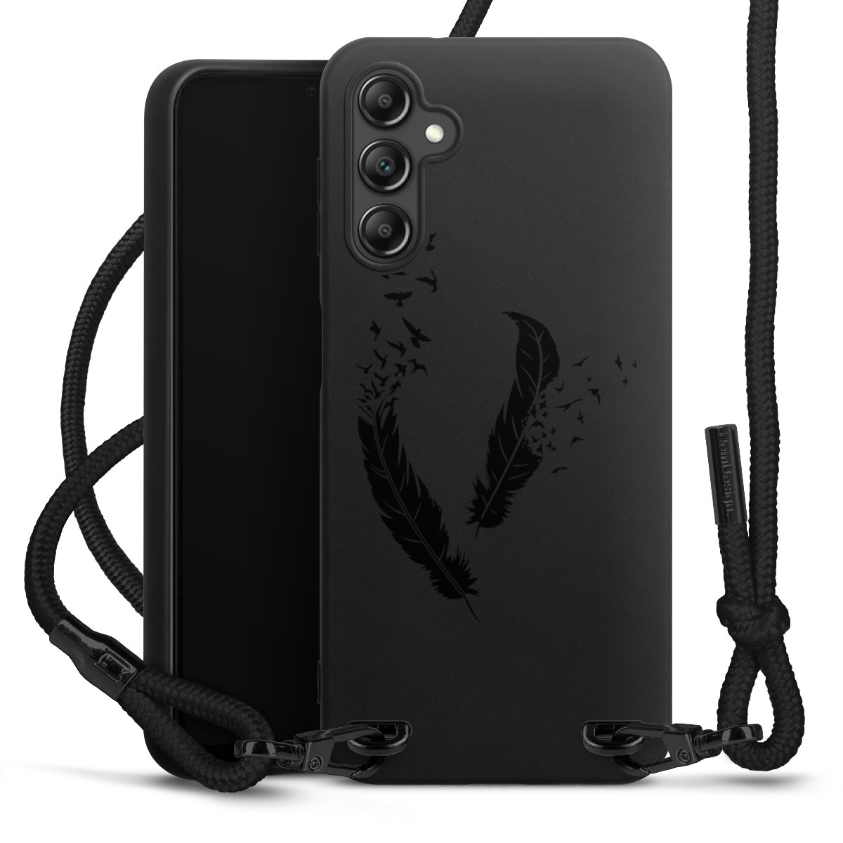 The matt black silicone case is made of flexible TPU (thermoplastic polyurethane) and offers robust protection. The durable, unbreakable material makes the cover flexible and dimensionally stable at the same time. The matte surface makes your design stand out more and is less susceptible to fingerprints and dirt. The stylish trend accessory fits comfortably in the hand and is perfectly complemented by the fabric (polyester) mobile phone strap. The braided fabric strap is approx. 1.70 metres long with a diameter of approx. 0.5 cm. Due to the special knotting technique, the length of the strap can be adjusted by simply pulling it, so that you can adapt it individually to your wishes. The practical case to wear around your neck is available with the fabric strap in black. As a little icing on the cake, we have provided the strap with a chic metal fastener in matt black. The strap is securely fastened to the case with loops made of high-quality genuine leather and press studs. The ends of the fabric strap are covered with metallic end caps and thus protected from fraying.