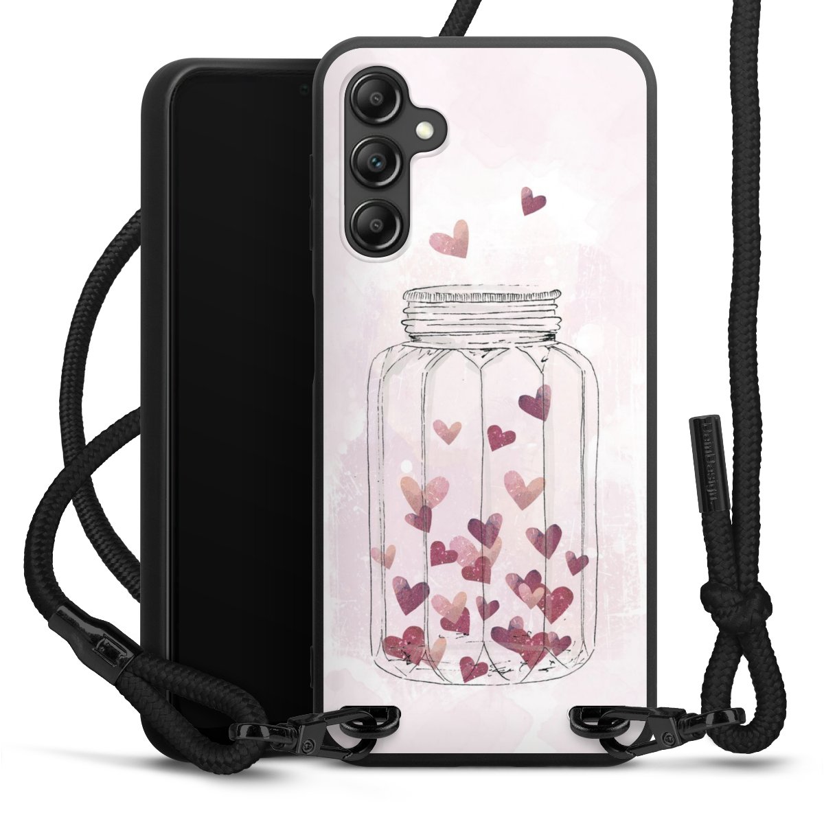 The matt black silicone case is made of flexible TPU (thermoplastic polyurethane) and offers robust protection. The durable, unbreakable material makes the cover flexible and dimensionally stable at the same time. The matte surface makes your design stand out more and is less susceptible to fingerprints and dirt. The stylish trend accessory fits comfortably in the hand and is perfectly complemented by the fabric (polyester) mobile phone strap. The braided fabric strap is approx. 1.70 metres long with a diameter of approx. 0.5 cm. Due to the special knotting technique, the length of the strap can be adjusted by simply pulling it, so that you can adapt it individually to your wishes. The practical case to wear around your neck is available with the fabric strap in black. As a little icing on the cake, we have provided the strap with a chic metal fastener in matt black. The strap is securely fastened to the case with loops made of high-quality genuine leather and press studs. The ends of the fabric strap are covered with metallic end caps and thus protected from fraying.