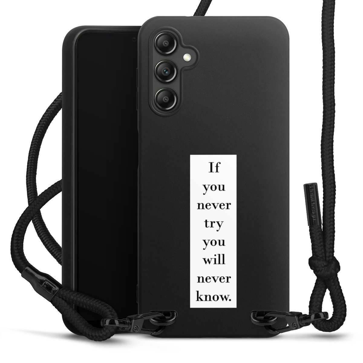 The matt black silicone case is made of flexible TPU (thermoplastic polyurethane) and offers robust protection. The durable, unbreakable material makes the cover flexible and dimensionally stable at the same time. The matte surface makes your design stand out more and is less susceptible to fingerprints and dirt. The stylish trend accessory fits comfortably in the hand and is perfectly complemented by the fabric (polyester) mobile phone strap. The braided fabric strap is approx. 1.70 metres long with a diameter of approx. 0.5 cm. Due to the special knotting technique, the length of the strap can be adjusted by simply pulling it, so that you can adapt it individually to your wishes. The practical case to wear around your neck is available with the fabric strap in black. As a little icing on the cake, we have provided the strap with a chic metal fastener in matt black. The strap is securely fastened to the case with loops made of high-quality genuine leather and press studs. The ends of the fabric strap are covered with metallic end caps and thus protected from fraying.
