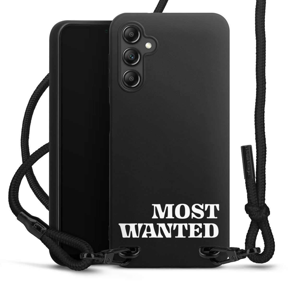 The matt black silicone case is made of flexible TPU (thermoplastic polyurethane) and offers robust protection. The durable, unbreakable material makes the cover flexible and dimensionally stable at the same time. The matte surface makes your design stand out more and is less susceptible to fingerprints and dirt. The stylish trend accessory fits comfortably in the hand and is perfectly complemented by the fabric (polyester) mobile phone strap. The braided fabric strap is approx. 1.70 metres long with a diameter of approx. 0.5 cm. Due to the special knotting technique, the length of the strap can be adjusted by simply pulling it, so that you can adapt it individually to your wishes. The practical case to wear around your neck is available with the fabric strap in black. As a little icing on the cake, we have provided the strap with a chic metal fastener in matt black. The strap is securely fastened to the case with loops made of high-quality genuine leather and press studs. The ends of the fabric strap are covered with metallic end caps and thus protected from fraying.
