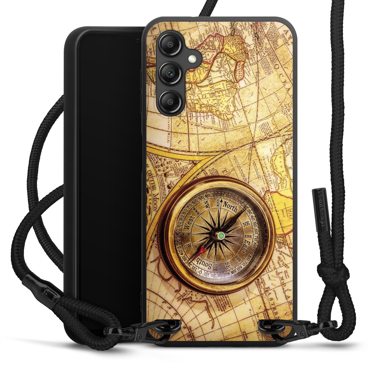 The matt black silicone case is made of flexible TPU (thermoplastic polyurethane) and offers robust protection. The durable, unbreakable material makes the cover flexible and dimensionally stable at the same time. The matte surface makes your design stand out more and is less susceptible to fingerprints and dirt. The stylish trend accessory fits comfortably in the hand and is perfectly complemented by the fabric (polyester) mobile phone strap. The braided fabric strap is approx. 1.70 metres long with a diameter of approx. 0.5 cm. Due to the special knotting technique, the length of the strap can be adjusted by simply pulling it, so that you can adapt it individually to your wishes. The practical case to wear around your neck is available with the fabric strap in black. As a little icing on the cake, we have provided the strap with a chic metal fastener in matt black. The strap is securely fastened to the case with loops made of high-quality genuine leather and press studs. The ends of the fabric strap are covered with metallic end caps and thus protected from fraying.