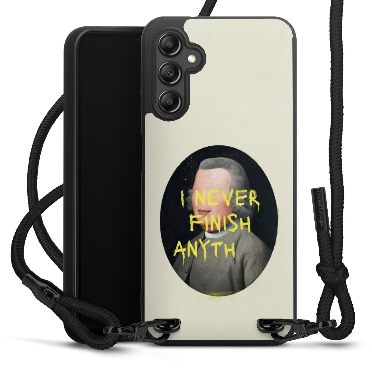 The matt black silicone case is made of flexible TPU (thermoplastic polyurethane) and offers robust protection. The durable, unbreakable material makes the cover flexible and dimensionally stable at the same time. The matte surface makes your design stand out more and is less susceptible to fingerprints and dirt. The stylish trend accessory fits comfortably in the hand and is perfectly complemented by the fabric (polyester) mobile phone strap. The braided fabric strap is approx. 1.70 metres long with a diameter of approx. 0.5 cm. Due to the special knotting technique, the length of the strap can be adjusted by simply pulling it, so that you can adapt it individually to your wishes. The practical case to wear around your neck is available with the fabric strap in black. As a little icing on the cake, we have provided the strap with a chic metal fastener in matt black. The strap is securely fastened to the case with loops made of high-quality genuine leather and press studs. The ends of the fabric strap are covered with metallic end caps and thus protected from fraying.