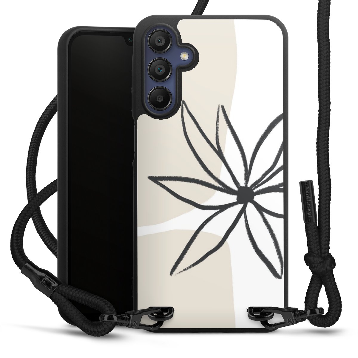 The matt black silicone case is made of flexible TPU (thermoplastic polyurethane) and offers robust protection. The durable, unbreakable material makes the cover flexible and dimensionally stable at the same time. The matte surface makes your design stand out more and is less susceptible to fingerprints and dirt. The stylish trend accessory fits comfortably in the hand and is perfectly complemented by the fabric (polyester) mobile phone strap. The braided fabric strap is approx. 1.70 metres long with a diameter of approx. 0.5 cm. Due to the special knotting technique, the length of the strap can be adjusted by simply pulling it, so that you can adapt it individually to your wishes. The practical case to wear around your neck is available with the fabric strap in black. As a little icing on the cake, we have provided the strap with a chic metal fastener in matt black. The strap is securely fastened to the case with loops made of high-quality genuine leather and press studs. The ends of the fabric strap are covered with metallic end caps and thus protected from fraying.