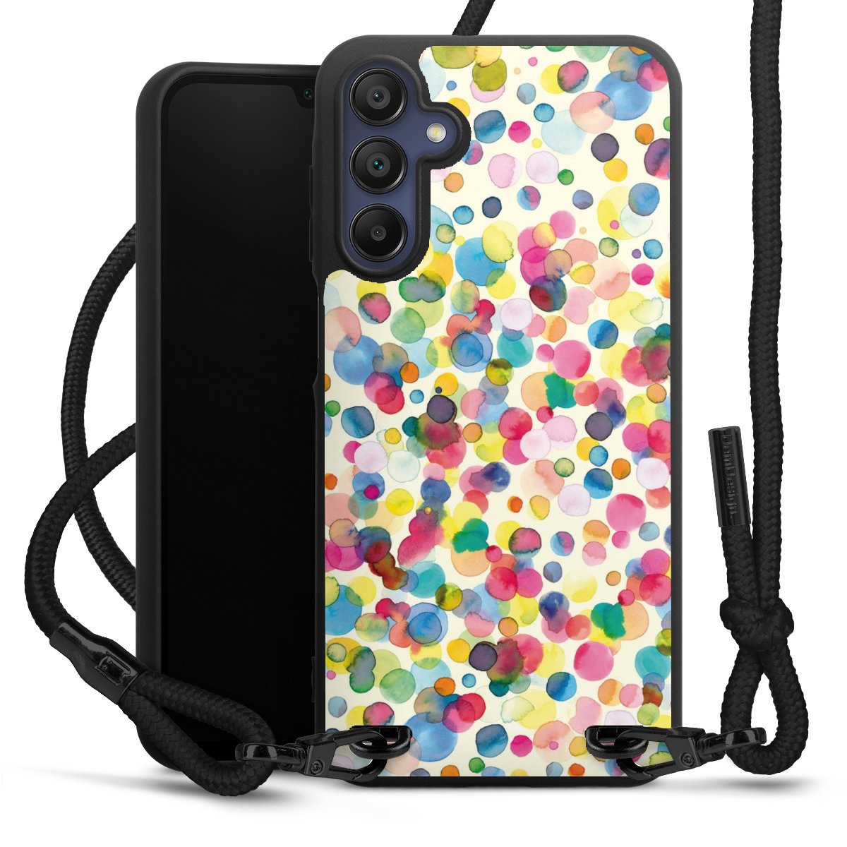 The matt black silicone case is made of flexible TPU (thermoplastic polyurethane) and offers robust protection. The durable, unbreakable material makes the cover flexible and dimensionally stable at the same time. The matte surface makes your design stand out more and is less susceptible to fingerprints and dirt. The stylish trend accessory fits comfortably in the hand and is perfectly complemented by the fabric (polyester) mobile phone strap. The braided fabric strap is approx. 1.70 metres long with a diameter of approx. 0.5 cm. Due to the special knotting technique, the length of the strap can be adjusted by simply pulling it, so that you can adapt it individually to your wishes. The practical case to wear around your neck is available with the fabric strap in black. As a little icing on the cake, we have provided the strap with a chic metal fastener in matt black. The strap is securely fastened to the case with loops made of high-quality genuine leather and press studs. The ends of the fabric strap are covered with metallic end caps and thus protected from fraying.