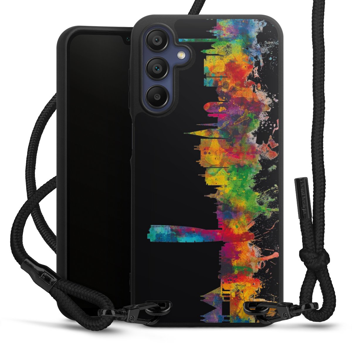 We use the solid direct print process for this phone case, which is why the print area only covers the back and the edge remains unprinted. The case to wear around your neck can be ordered unprinted, fully printed, or partially printed. For your design, either choose one of our exclusive shop motifs or get creative and create your own design, for example with photos and overlays. Design your own personal trend accessory and make an individual statement on the streets!