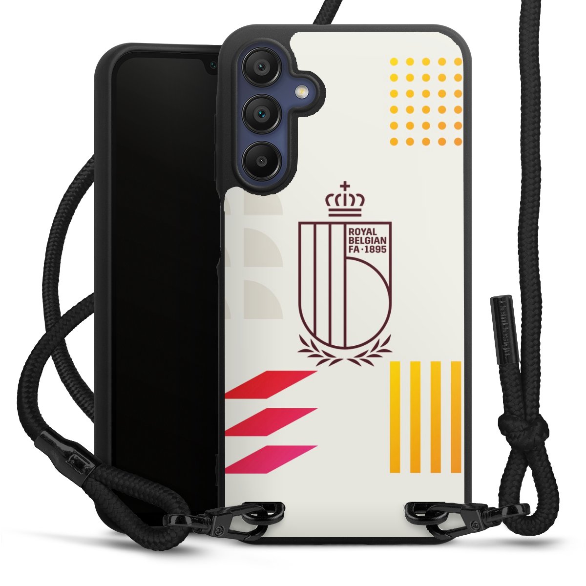 The matt black silicone case is made of flexible TPU (thermoplastic polyurethane) and offers robust protection. The durable, unbreakable material makes the cover flexible and dimensionally stable at the same time. The matte surface makes your design stand out more and is less susceptible to fingerprints and dirt. The stylish trend accessory fits comfortably in the hand and is perfectly complemented by the fabric (polyester) mobile phone strap. The braided fabric strap is approx. 1.70 metres long with a diameter of approx. 0.5 cm. Due to the special knotting technique, the length of the strap can be adjusted by simply pulling it, so that you can adapt it individually to your wishes. The practical case to wear around your neck is available with the fabric strap in black. As a little icing on the cake, we have provided the strap with a chic metal fastener in matt black. The strap is securely fastened to the case with loops made of high-quality genuine leather and press studs. The ends of the fabric strap are covered with metallic end caps and thus protected from fraying.