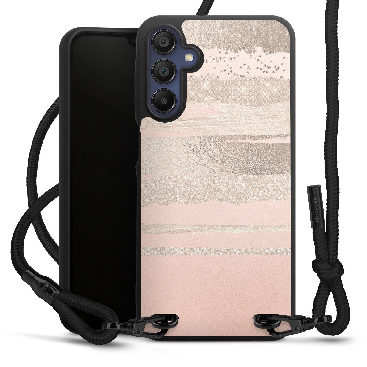 The matt black silicone case is made of flexible TPU (thermoplastic polyurethane) and offers robust protection. The durable, unbreakable material makes the cover flexible and dimensionally stable at the same time. The matte surface makes your design stand out more and is less susceptible to fingerprints and dirt. The stylish trend accessory fits comfortably in the hand and is perfectly complemented by the fabric (polyester) mobile phone strap. The braided fabric strap is approx. 1.70 metres long with a diameter of approx. 0.5 cm. Due to the special knotting technique, the length of the strap can be adjusted by simply pulling it, so that you can adapt it individually to your wishes. The practical case to wear around your neck is available with the fabric strap in black. As a little icing on the cake, we have provided the strap with a chic metal fastener in matt black. The strap is securely fastened to the case with loops made of high-quality genuine leather and press studs. The ends of the fabric strap are covered with metallic end caps and thus protected from fraying.