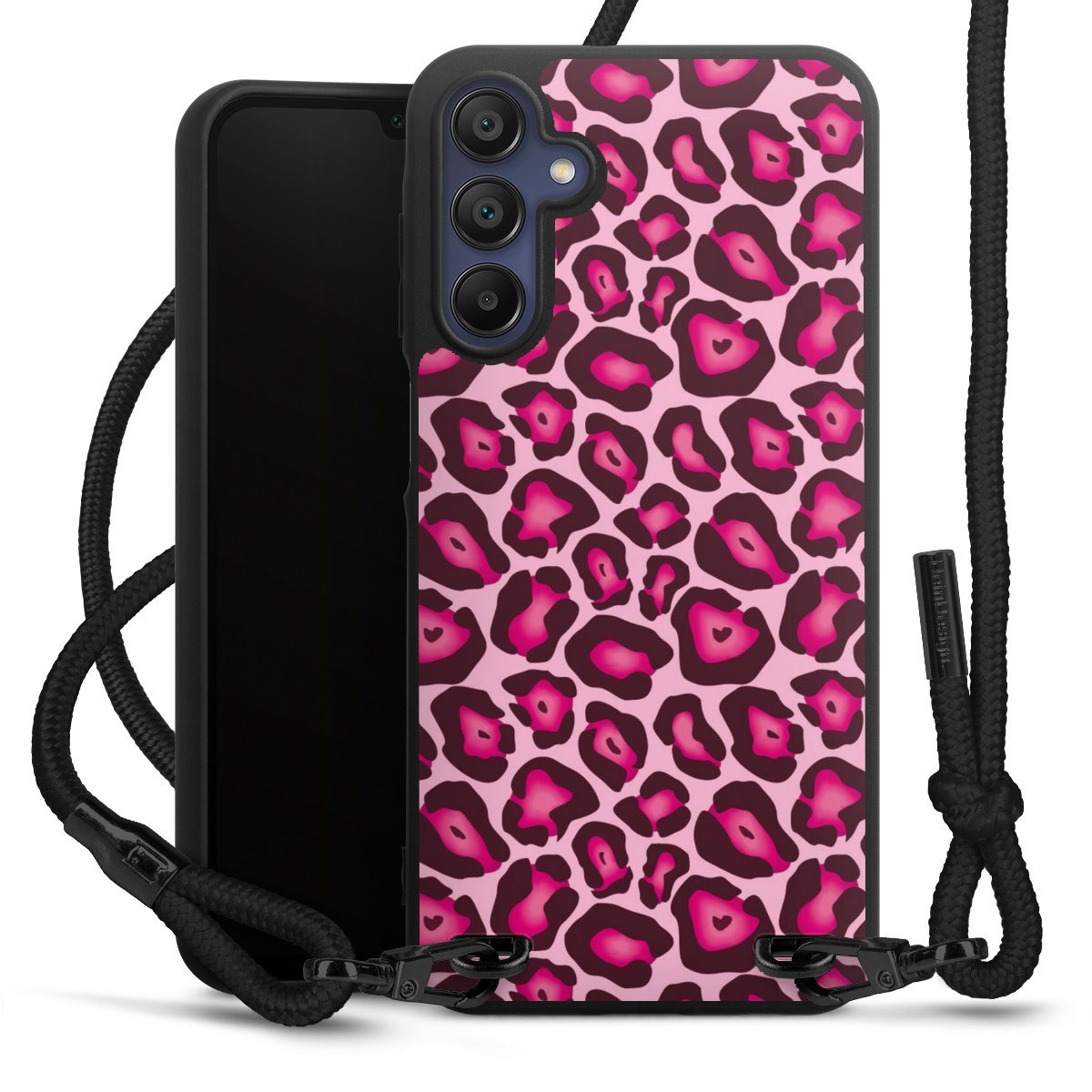 The matt black silicone case is made of flexible TPU (thermoplastic polyurethane) and offers robust protection. The durable, unbreakable material makes the cover flexible and dimensionally stable at the same time. The matte surface makes your design stand out more and is less susceptible to fingerprints and dirt. The stylish trend accessory fits comfortably in the hand and is perfectly complemented by the fabric (polyester) mobile phone strap. The braided fabric strap is approx. 1.70 metres long with a diameter of approx. 0.5 cm. Due to the special knotting technique, the length of the strap can be adjusted by simply pulling it, so that you can adapt it individually to your wishes. The practical case to wear around your neck is available with the fabric strap in black. As a little icing on the cake, we have provided the strap with a chic metal fastener in matt black. The strap is securely fastened to the case with loops made of high-quality genuine leather and press studs. The ends of the fabric strap are covered with metallic end caps and thus protected from fraying.