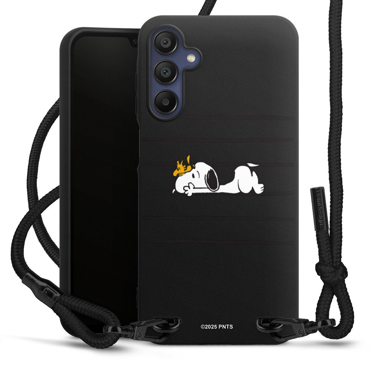 The matt black silicone case is made of flexible TPU (thermoplastic polyurethane) and offers robust protection. The durable, unbreakable material makes the cover flexible and dimensionally stable at the same time. The matte surface makes your design stand out more and is less susceptible to fingerprints and dirt. The stylish trend accessory fits comfortably in the hand and is perfectly complemented by the fabric (polyester) mobile phone strap. The braided fabric strap is approx. 1.70 metres long with a diameter of approx. 0.5 cm. Due to the special knotting technique, the length of the strap can be adjusted by simply pulling it, so that you can adapt it individually to your wishes. The practical case to wear around your neck is available with the fabric strap in black. As a little icing on the cake, we have provided the strap with a chic metal fastener in matt black. The strap is securely fastened to the case with loops made of high-quality genuine leather and press studs. The ends of the fabric strap are covered with metallic end caps and thus protected from fraying.