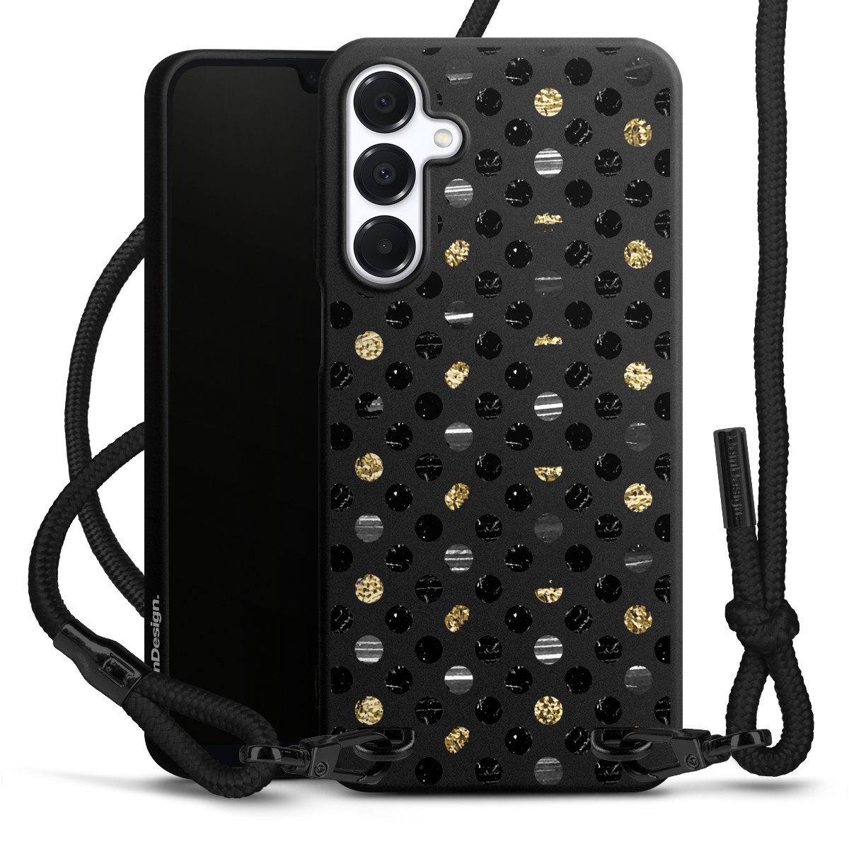 The matt black silicone case is made of flexible TPU (thermoplastic polyurethane) and offers robust protection. The durable, unbreakable material makes the cover flexible and dimensionally stable at the same time. The matte surface makes your design stand out more and is less susceptible to fingerprints and dirt. The stylish trend accessory fits comfortably in the hand and is perfectly complemented by the fabric (polyester) mobile phone strap. The braided fabric strap is approx. 1.70 metres long with a diameter of approx. 0.5 cm. Due to the special knotting technique, the length of the strap can be adjusted by simply pulling it, so that you can adapt it individually to your wishes. The practical case to wear around your neck is available with the fabric strap in black. As a little icing on the cake, we have provided the strap with a chic metal fastener in matt black. The strap is securely fastened to the case with loops made of high-quality genuine leather and press studs. The ends of the fabric strap are covered with metallic end caps and thus protected from fraying.