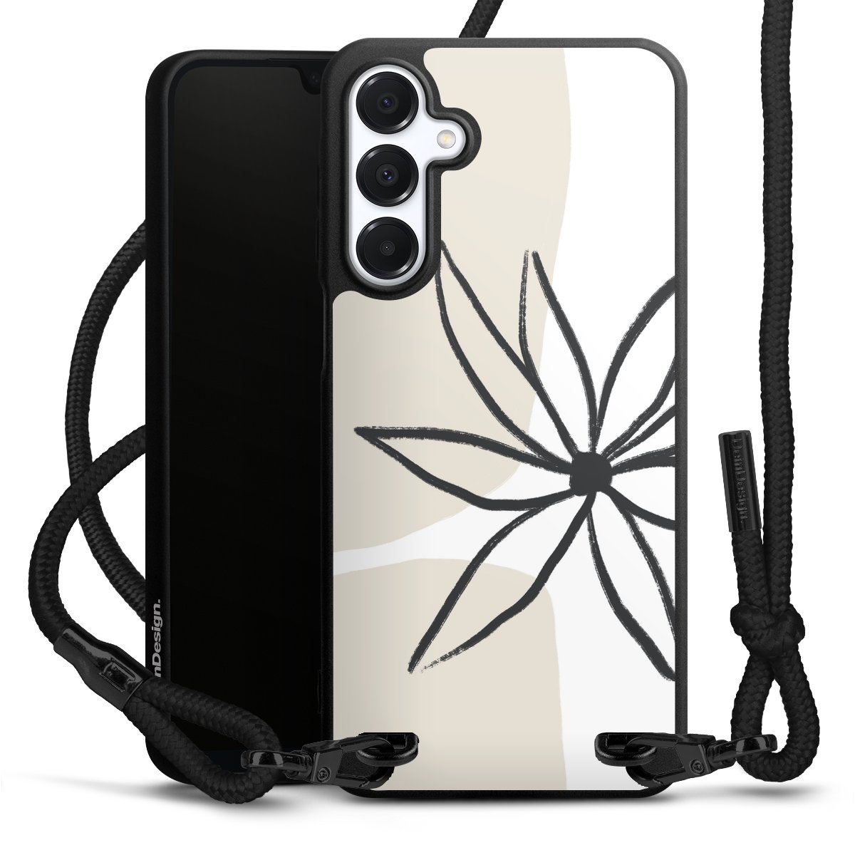 The matt black silicone case is made of flexible TPU (thermoplastic polyurethane) and offers robust protection. The durable, unbreakable material makes the cover flexible and dimensionally stable at the same time. The matte surface makes your design stand out more and is less susceptible to fingerprints and dirt. The stylish trend accessory fits comfortably in the hand and is perfectly complemented by the fabric (polyester) mobile phone strap. The braided fabric strap is approx. 1.70 metres long with a diameter of approx. 0.5 cm. Due to the special knotting technique, the length of the strap can be adjusted by simply pulling it, so that you can adapt it individually to your wishes. The practical case to wear around your neck is available with the fabric strap in black. As a little icing on the cake, we have provided the strap with a chic metal fastener in matt black. The strap is securely fastened to the case with loops made of high-quality genuine leather and press studs. The ends of the fabric strap are covered with metallic end caps and thus protected from fraying.