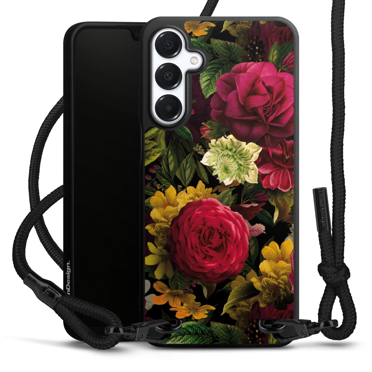 The matt black silicone case is made of flexible TPU (thermoplastic polyurethane) and offers robust protection. The durable, unbreakable material makes the cover flexible and dimensionally stable at the same time. The matte surface makes your design stand out more and is less susceptible to fingerprints and dirt. The stylish trend accessory fits comfortably in the hand and is perfectly complemented by the fabric (polyester) mobile phone strap. The braided fabric strap is approx. 1.70 metres long with a diameter of approx. 0.5 cm. Due to the special knotting technique, the length of the strap can be adjusted by simply pulling it, so that you can adapt it individually to your wishes. The practical case to wear around your neck is available with the fabric strap in black. As a little icing on the cake, we have provided the strap with a chic metal fastener in matt black. The strap is securely fastened to the case with loops made of high-quality genuine leather and press studs. The ends of the fabric strap are covered with metallic end caps and thus protected from fraying.