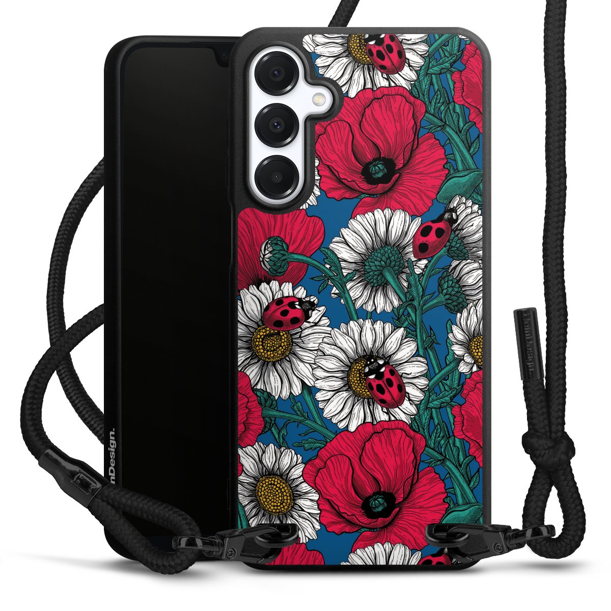 The matt black silicone case is made of flexible TPU (thermoplastic polyurethane) and offers robust protection. The durable, unbreakable material makes the cover flexible and dimensionally stable at the same time. The matte surface makes your design stand out more and is less susceptible to fingerprints and dirt. The stylish trend accessory fits comfortably in the hand and is perfectly complemented by the fabric (polyester) mobile phone strap. The braided fabric strap is approx. 1.70 metres long with a diameter of approx. 0.5 cm. Due to the special knotting technique, the length of the strap can be adjusted by simply pulling it, so that you can adapt it individually to your wishes. The practical case to wear around your neck is available with the fabric strap in black. As a little icing on the cake, we have provided the strap with a chic metal fastener in matt black. The strap is securely fastened to the case with loops made of high-quality genuine leather and press studs. The ends of the fabric strap are covered with metallic end caps and thus protected from fraying.