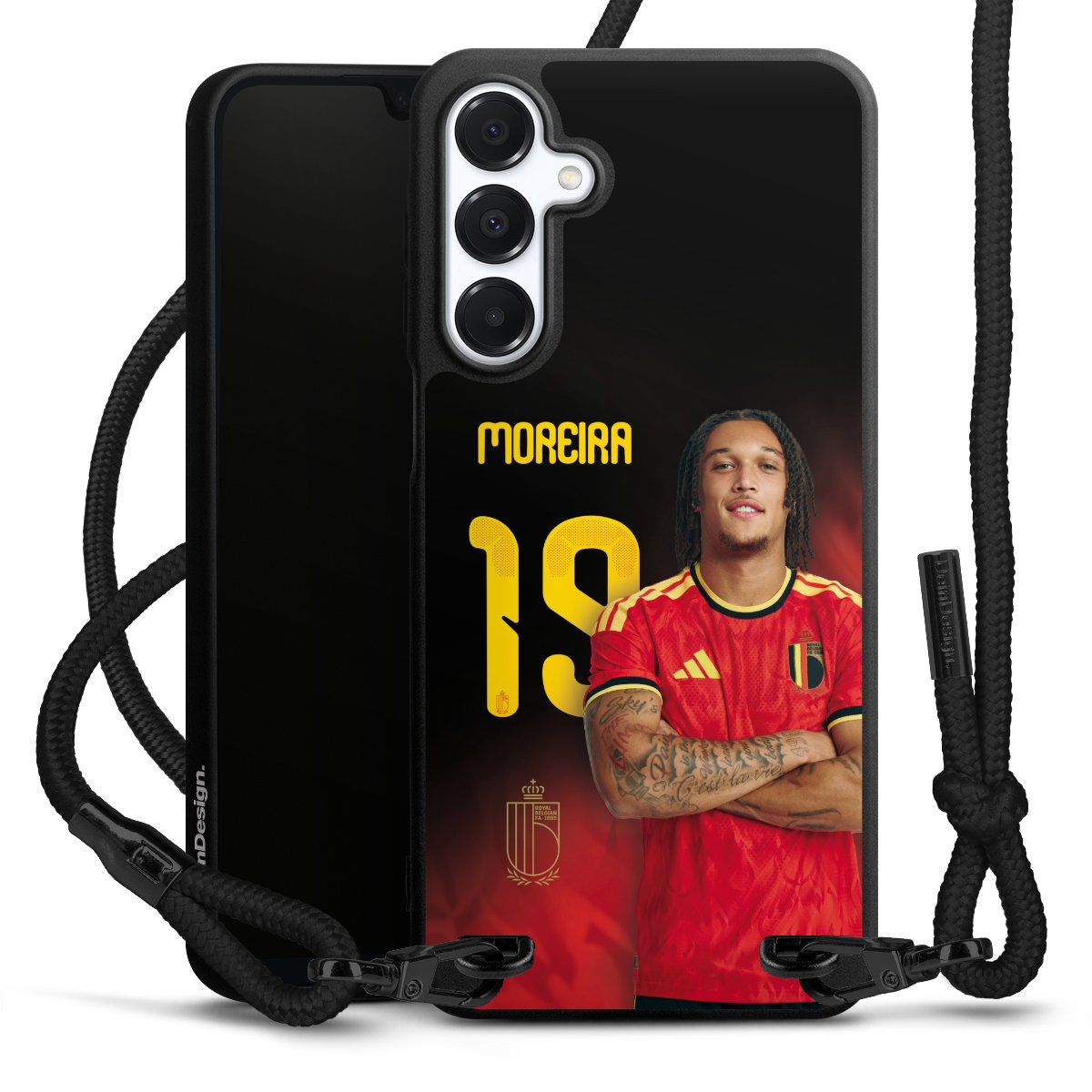 The matt black silicone case is made of flexible TPU (thermoplastic polyurethane) and offers robust protection. The durable, unbreakable material makes the cover flexible and dimensionally stable at the same time. The matte surface makes your design stand out more and is less susceptible to fingerprints and dirt. The stylish trend accessory fits comfortably in the hand and is perfectly complemented by the fabric (polyester) mobile phone strap. The braided fabric strap is approx. 1.70 metres long with a diameter of approx. 0.5 cm. Due to the special knotting technique, the length of the strap can be adjusted by simply pulling it, so that you can adapt it individually to your wishes. The practical case to wear around your neck is available with the fabric strap in black. As a little icing on the cake, we have provided the strap with a chic metal fastener in matt black. The strap is securely fastened to the case with loops made of high-quality genuine leather and press studs. The ends of the fabric strap are covered with metallic end caps and thus protected from fraying.