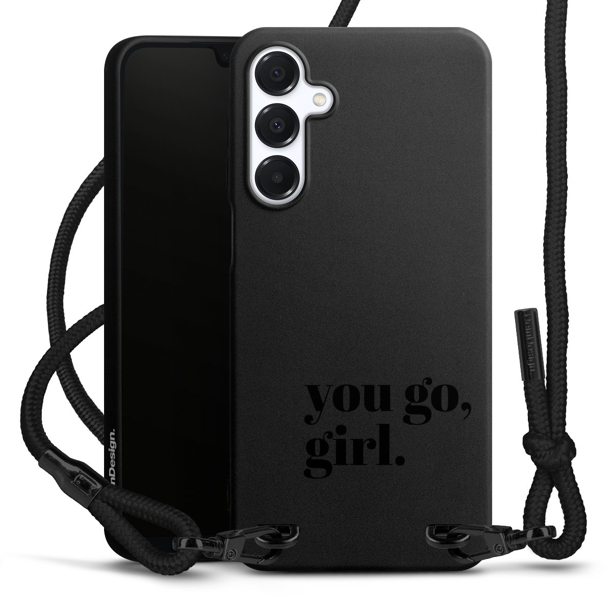 The matt black silicone case is made of flexible TPU (thermoplastic polyurethane) and offers robust protection. The durable, unbreakable material makes the cover flexible and dimensionally stable at the same time. The matte surface makes your design stand out more and is less susceptible to fingerprints and dirt. The stylish trend accessory fits comfortably in the hand and is perfectly complemented by the fabric (polyester) mobile phone strap. The braided fabric strap is approx. 1.70 metres long with a diameter of approx. 0.5 cm. Due to the special knotting technique, the length of the strap can be adjusted by simply pulling it, so that you can adapt it individually to your wishes. The practical case to wear around your neck is available with the fabric strap in black. As a little icing on the cake, we have provided the strap with a chic metal fastener in matt black. The strap is securely fastened to the case with loops made of high-quality genuine leather and press studs. The ends of the fabric strap are covered with metallic end caps and thus protected from fraying.
