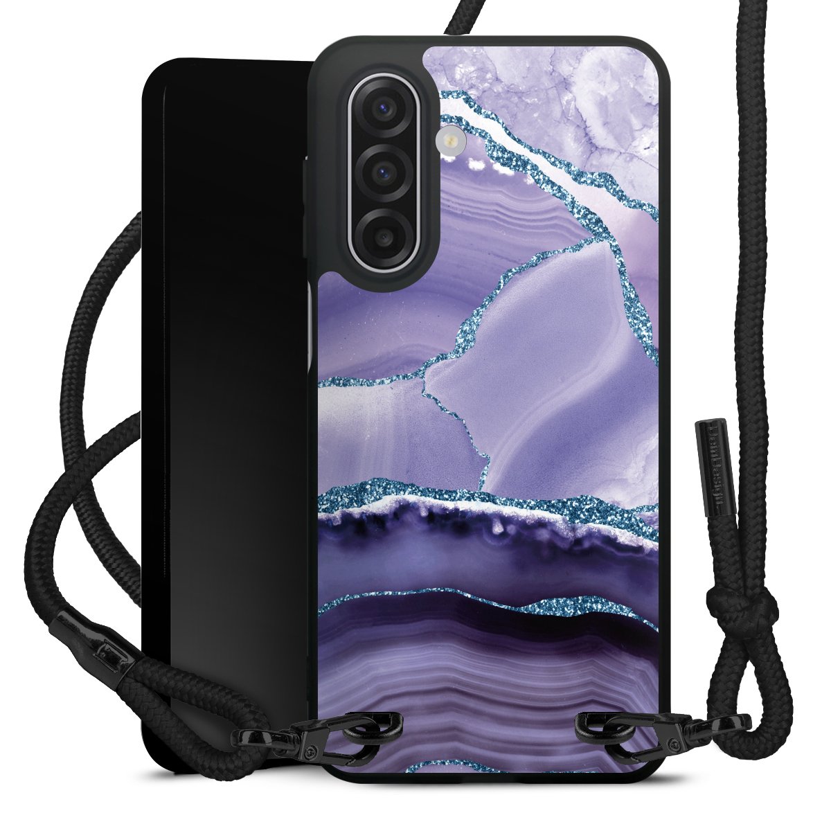 The matt black silicone case is made of flexible TPU (thermoplastic polyurethane) and offers robust protection. The durable, unbreakable material makes the cover flexible and dimensionally stable at the same time. The matte surface makes your design stand out more and is less susceptible to fingerprints and dirt. The stylish trend accessory fits comfortably in the hand and is perfectly complemented by the fabric (polyester) mobile phone strap. The braided fabric strap is approx. 1.70 metres long with a diameter of approx. 0.5 cm. Due to the special knotting technique, the length of the strap can be adjusted by simply pulling it, so that you can adapt it individually to your wishes. The practical case to wear around your neck is available with the fabric strap in black. As a little icing on the cake, we have provided the strap with a chic metal fastener in matt black. The strap is securely fastened to the case with loops made of high-quality genuine leather and press studs. The ends of the fabric strap are covered with metallic end caps and thus protected from fraying.