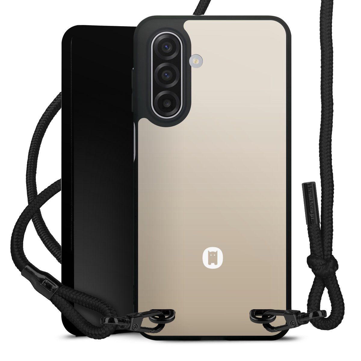 The matt black silicone case is made of flexible TPU (thermoplastic polyurethane) and offers robust protection. The durable, unbreakable material makes the cover flexible and dimensionally stable at the same time. The matte surface makes your design stand out more and is less susceptible to fingerprints and dirt. The stylish trend accessory fits comfortably in the hand and is perfectly complemented by the fabric (polyester) mobile phone strap. The braided fabric strap is approx. 1.70 metres long with a diameter of approx. 0.5 cm. Due to the special knotting technique, the length of the strap can be adjusted by simply pulling it, so that you can adapt it individually to your wishes. The practical case to wear around your neck is available with the fabric strap in black. As a little icing on the cake, we have provided the strap with a chic metal fastener in matt black. The strap is securely fastened to the case with loops made of high-quality genuine leather and press studs. The ends of the fabric strap are covered with metallic end caps and thus protected from fraying.